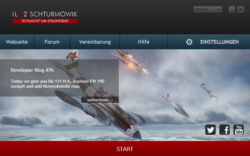 Foobar Posted August 30, 2014 Posted August 30, 2014 Bin fast der Meinung, dass es weitgehend unbekannt sein dürfte, dass der Launcher auf auf deutsch geht. Dazu ist ein kleiner Eingriff in die Datei .\IL-2 Sturmovik Battle of Stalingrad\data\startup.cfg nötig (Launcher zuvor beenden): [KEY = updater] enable_udp = 0 language = "ger" locales = "rus,eng,ger" p2p_port = 6881 seed = 0 web_distribution = 0 Bei "language" wird "ger" eingetragen, und bei "locales" ebenfalls "ger" hinzugefügt (mit Komma trennen). Danach Laucher neu starten und Deutsch als Sprache auswählen. (Das Spiele-GUI kann allerdings noch nicht auf deutsch eingestellt werden.) 1