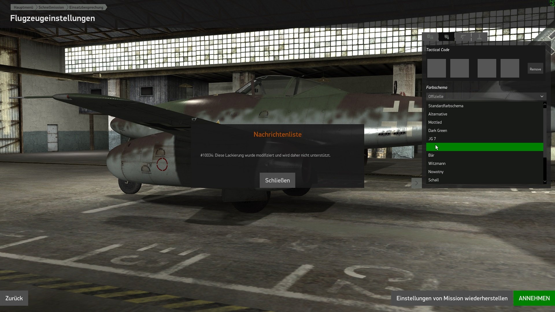 ACG_Bussard Posted June 1, 2023 Posted June 1, 2023 Error at Me 262 color scheme selection On the Me 262, the sixth skin (unpainted) has no description and the selection ends with an error message. IL-2 in German language without mods. Screenshots: