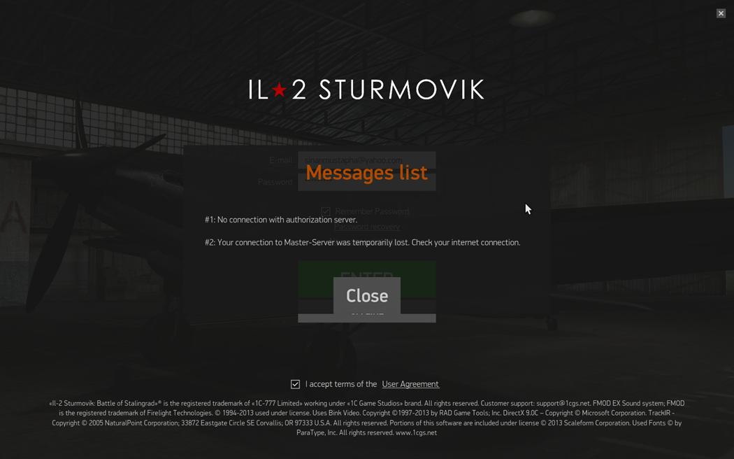 Case Posted January 13, 2017 Posted January 13, 2017 I have problem in login account. "Message List" #1: No connection with autorization server. #2: Your connection to Master-Server was temporarily lost. Check your internet connection. Exactly the same error: Since (at least) yesterday, I cannot log into IL-2 Sturmovik Battle of Stalingrad, neither the onlin-version, nor the offline-version. * When I try to log into the online-mode, I get the following errorcodes: #1: No connection with authorization Server. #2: Your connection to Master-Server was lost. Please check your Internet connection. * When I try to enter the offline-mode, I receive: #10005: Please update your game: New Version available. My Internet-connection is fine, and if there was an Update available, Steam should download it automatically.