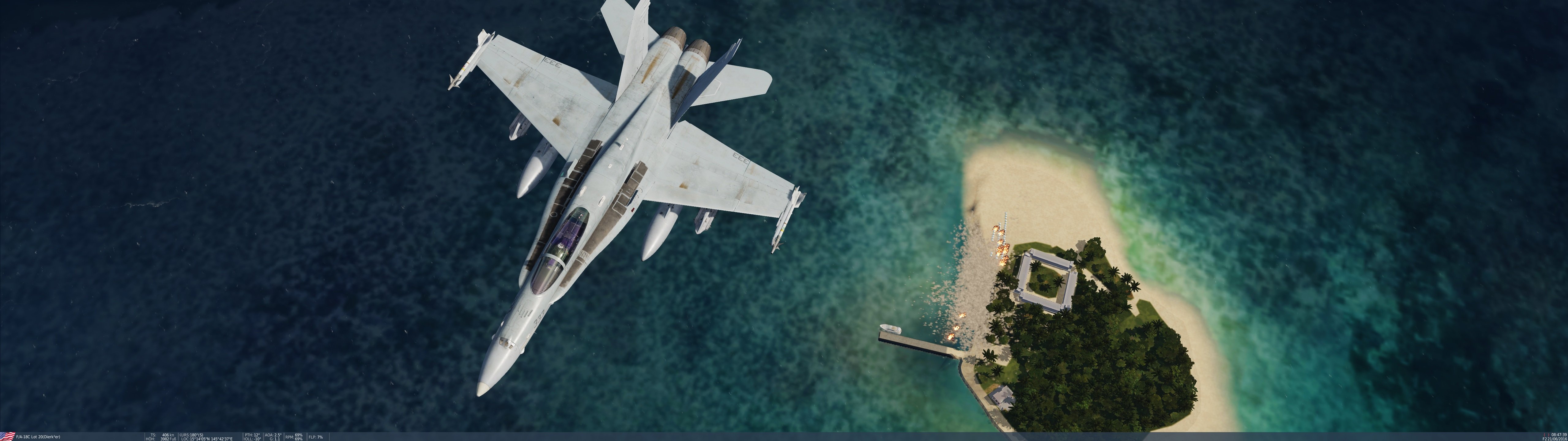 Dierk3er Posted July 10, 2021 Posted July 10, 2021 (edited) Was Bröms vergessen hat zu erwähnen, dass er vorher noch ordentlich Einstecken musste. Hat ihn aber nicht davon abgehalten, den Feind weiter unter Beschuss zu nehmen. Hier zusammen mit Pancake... ...Brömsi im Hintergrund am Qualmen... Anschließend flugs das Fluggerät gewechselt. Während meine Wenigkeit in der Hornet erst einmal die neue Insel aus der Luft abcheckte. Die sieht echt klasse aus. Und besonders wenn man bedenkt, dass die Karte umsonst ist. ? Und gleich mal ein paar Tourist...äh...Terroristen am Strand in den Himmel geschickt. Einweisungsflug mit Robin auf der Hornet. Links Herr Brems, rechts Herr Robin, und in der Mitte meine Maschine. Heiko (Geleitzug) mit der F-16 auf Piratenjagd. So langsam wurde es dunkel..... Stimmungsvolle Bilder.... Auf dem Weg um ein paar Tu-22, Tu-95 und Mig-31 abzufangen. Mond und Sterne spiegeln sich im Meer, zwischen den Wolken. Hier Blooddawn mit der F-14. Nach gemeinsamer Abfangmission musste Pancake an den Tanker. Kein leichtes Unterfangen bei absoluter Dunkelheit. Zum Abschluss noch eine letzte Nachtrunde im Hind bevor ich in die Koje wanderte. ? Hat Spass gemacht. Edited July 10, 2021 by Dierk3er 4
