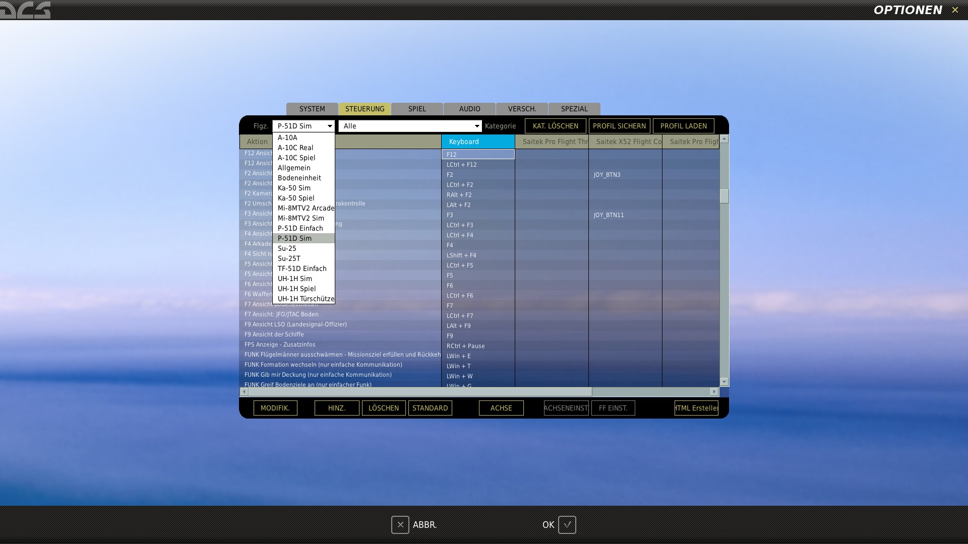 Blooddawn1942 Posted April 29, 2014 Posted April 29, 2014 Es gibt kein Belegungsmenü für die TF 51 unter sim Bedingungen. ich bekomme im Drop Down Menü unter Optionen/Steuerung einzig das belegungsmenü für Spiel/Arcade angezeigt. So nutzt mir der Vogel nichts. Schade eigentlich. Der wiegt ja fast ne tonne weniger als die P 51. Könnte man auf dem Virtual Aerobatics Server sicherlich phantastisch Figuren fliegen... Aber wenn ich den Vogel nicht Full Real fliegen bzw. konfigurieren kann, bringts mir nichts...