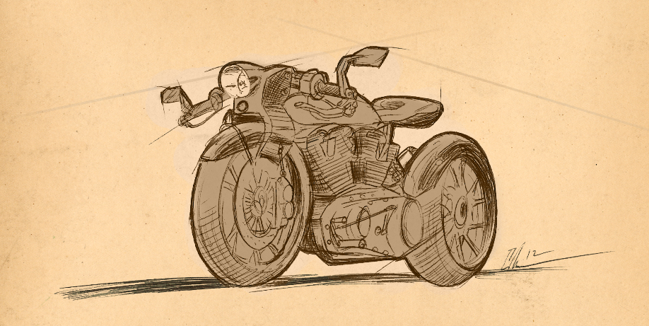 SOLIDKREATE Posted November 24, 2014 Posted November 24, 2014 A blast from the past. I drew this almost three years ago when I was on break at work. It has a Harley-Davidson 1200cc air cooled V-Twin used as a load bearing structure. In addition it has custom crankcase covers with pegs built in. Custom CNC machined single arm fork and single sided swing arm. Mirrors are mounted on the ends of the CNC aluminum grips and reverse mounted brake and clutch controls. The turn LED signals are flush mounted in the seat as ell as the brake light. The forward signals are mounted in the grips. They extend out 6" (15cm) when engaged. The cockpit is a HUD that pops up when the bike is on. There is also a 7" OLED screen embedded on the top of the gas tank cover that serves as a dedicated GPS. It also has on board WiFi with 4G LTE. Too much more to list without illustration. This is more or less what is called a 'napkin sketch'.