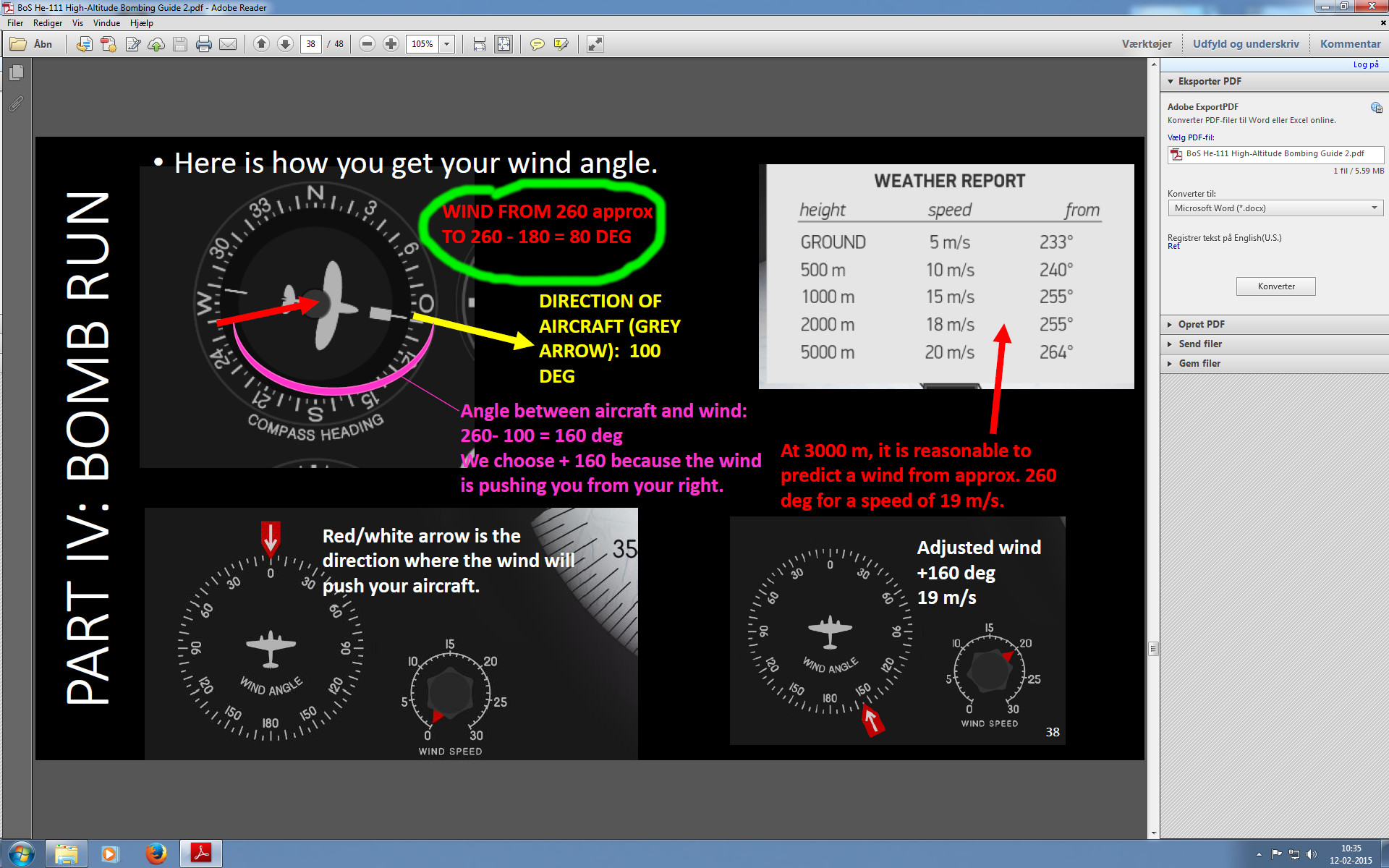 6./ZG26_Loke Posted February 12, 2015 Posted February 12, 2015 In the attached pic from Chucks guide about calculating the wind direction, I'm confused about the numbers in the green circle. Can anyone explain what they refer to?And what if my direction is 180 and wind is coming from 090. Would I then need to set it to the 090 on the left side?Another question.I dropped 2 1800kg from about 1800m, but they did not explode. They were set to direct impact. Is there a minimum altitude from where they can be dropped? BTW, gave up on automatic release. Now trying with manual.