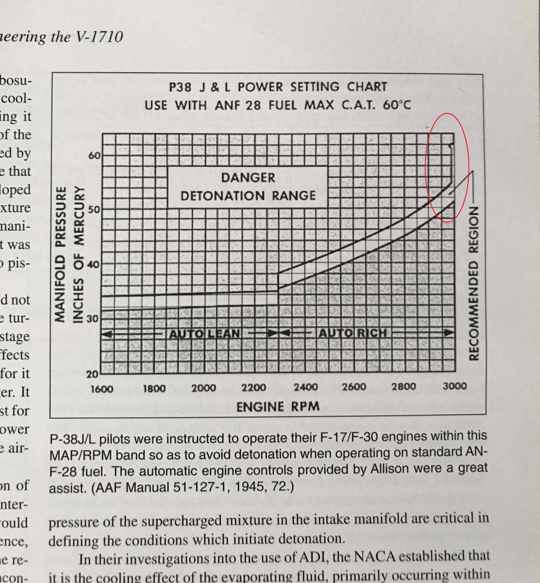 Farky Posted August 19, 2017 Posted August 19, 2017 Slightly OT : The Allisons in the P38 were very similar, only differing in that they used turbosuperchargers (which is a big difference). But the basic engine was the same as the V-1710-39. P-38J/L engines have blower gear ratio 8.10:1, V-1710-39 blower gear ratio was 8.8:1. We can not use same "detonation range chart" for both engines. Since the data refers to the P-38J/L, do you have the specific operational limits per manual for each regime in the P-38, when Allison understood their engines were tougher than initially thought? Data are from P-38J manual issued September 1943. In Operating instructions for V-1710-89/-91 (August 1943) are slightly diferent limits. MAXIMUM CRUISE - 35 inHg @ 2300 rpm - maximum AUTO LEAN (YELLOW) MAXIMUM CONTINUOUS - 44 inHg @ 2600 rpm - AUTO RICH (GREEN) WAR EMERGENCY - 60 inHg @ 3000 rpm - AUTO RICH (RED)