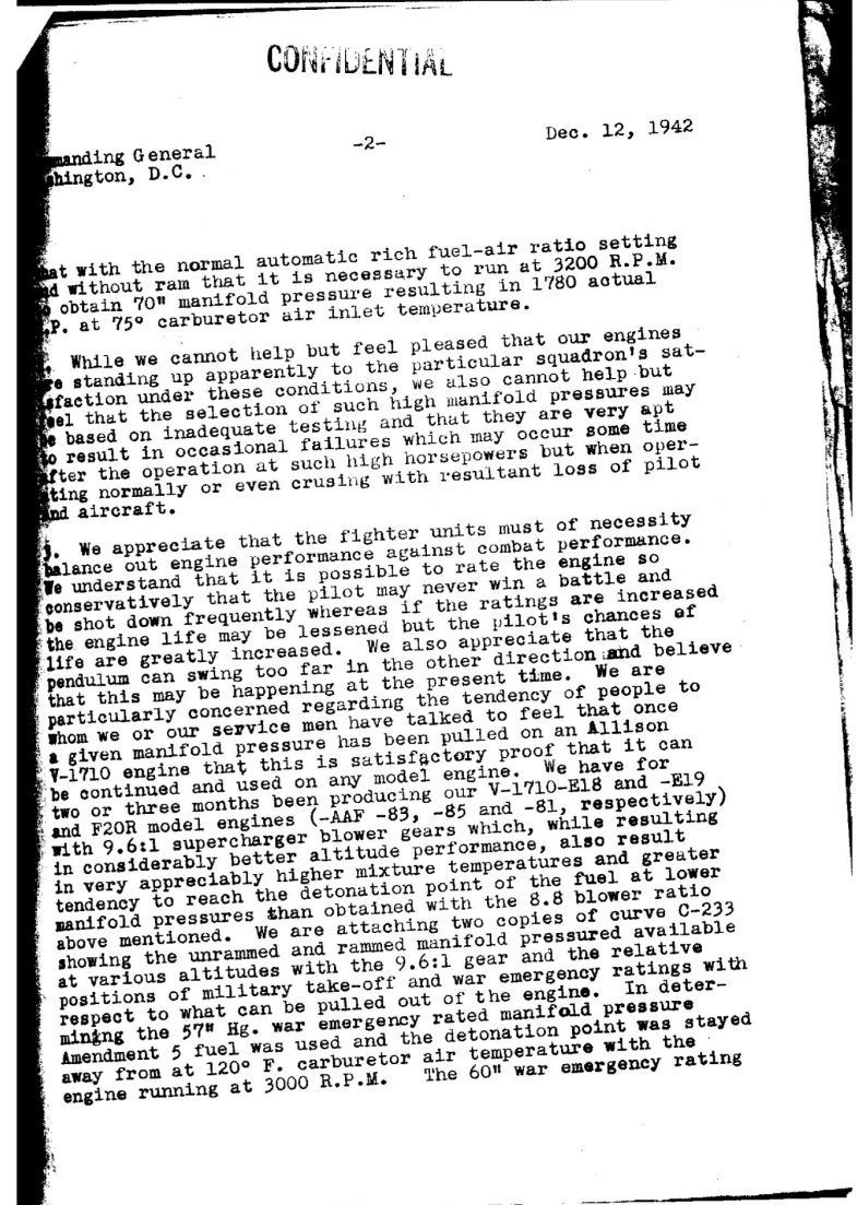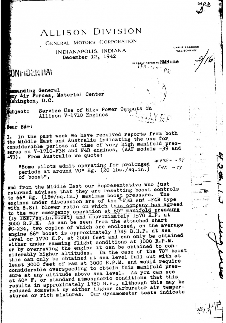 Venturi Posted August 18, 2017 Posted August 18, 2017 (edited) Like I said, engine failure modeling needs to be looked at. You can't have a one size fits all approach to engine failures. See my post on this topic more than a year ago: https://forum.il2sturmovik.com/topic/21234-p-40-engine-settings-i-found-them-bit-weird/?p=340873 This is old news for the old hands, but for those who aren't in the know, see attached for the letter from 1942, by the Chief Engineer of Allison, describing pilot practices of "going above and beyond official power ratings". It is also mentioned in Whitney's book. The 70" Hg manifold pressures he mentions as "requiring overspeeding" refers to manually running the engine RPM over maximum, to achieve a higher supercharger speed and thus a higher manifold pressure. Edited August 18, 2017 by Venturi