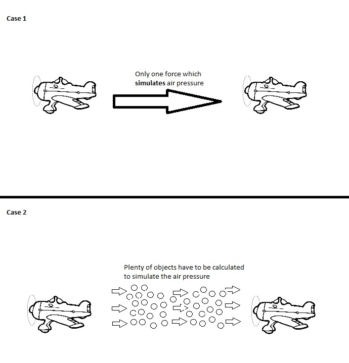 StG2_Manfred Posted March 4, 2015 Author Posted March 4, 2015 Ok, I give it one more try to explain. Beforehand I apologize for being a bad artist. I made a drawing which makes it hopefully more clear. It's of course possible to simulate a force like the turbulence of a propellor, the question is how it is achieved. In my pic you can see two cases, in case one I "put the wind force together" and have (in the best case) only one more calculation (e.g. speed of plane 2 minus the air pressure caused by plane 1). It does not behave like real air, but for the most situations it would be plausible enough to get the feeling of wind. In the second case, when we want to have "real air flow" with all it's consequences we would have to calculate tons of air particles and this brings a PC easily to it's knees and therefore does not happen.