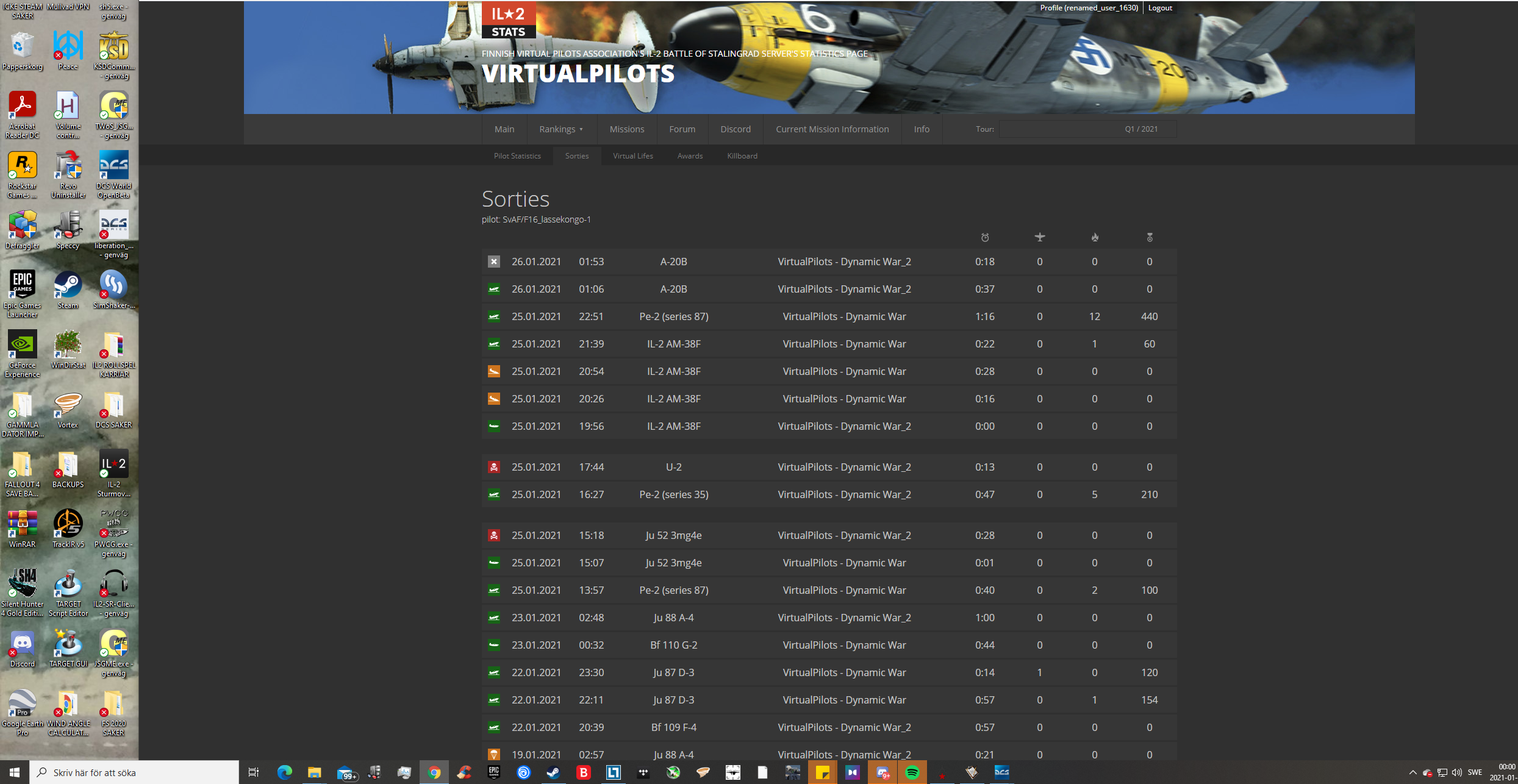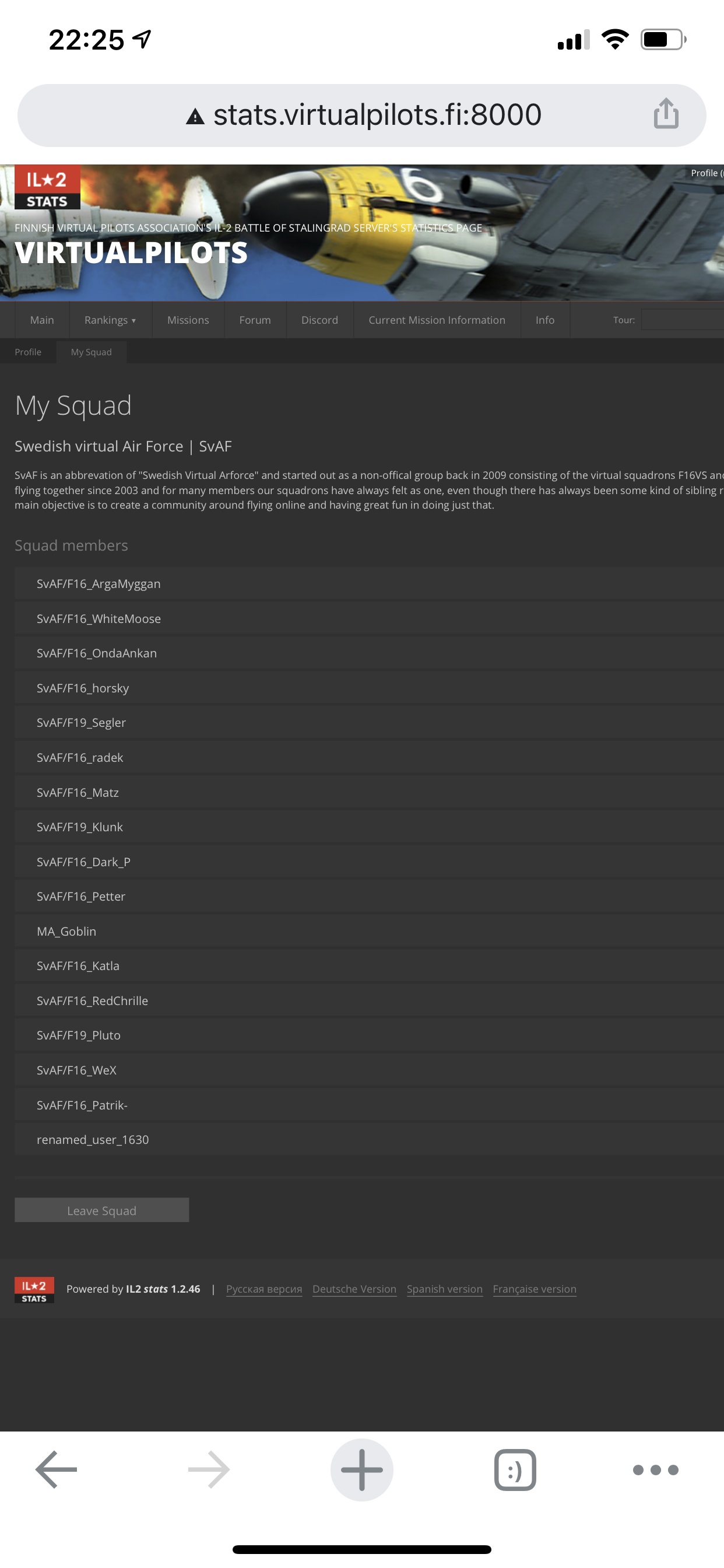 SvAF/F16_lassekongo Posted January 26, 2021 Posted January 26, 2021 (edited) I have a bit of a problem with il2 stats namely the finnish il2 stats. I have been in contact with temuri and he said i should check here as this problem have something to do with il2 stats. So the thing is when i first make the il2 account and put in the name everything works and my profile name matches the in game il2 account name. Then after one map rotation the il2 stats name changes to (renamed_user_1630) and stays this way. When i try to change it back to the correct in game name the stats page just crashes and displays ”server error 500” and i have to open the page again. And the weird thing is that i can then change my profile name to whatever i want and the change works but after one map rotation it changes back to renamed user._1630. I have ignored this issue for the past three weeks now because my sorties and stats are all logged correctly under the¨right username¨ that matches my il2 account name. The main problem is that my il2 stats pilot on finnish doesnt show up in my squadrons pilot list under squad rankings, When i click on my profile and then my squad i can see that i am part of the squad with the renamed_user_1630 name but when i look at my squad through squad rankings i am not listed as a pilot in the squad either as the correct username or the wrong renamed_user_1630 name. I know this problem sounds confusing but i would greatly appreciate help with this problem so that i have the correct name and can be part of my squadrons stats. PS: I have posted three pictures so my problem and explanation makes a little more sense, the one listing my latest sorties list is just so that you can see that it syncs correctly. Edited January 26, 2021 by SvAF/F16_lassekongo-1