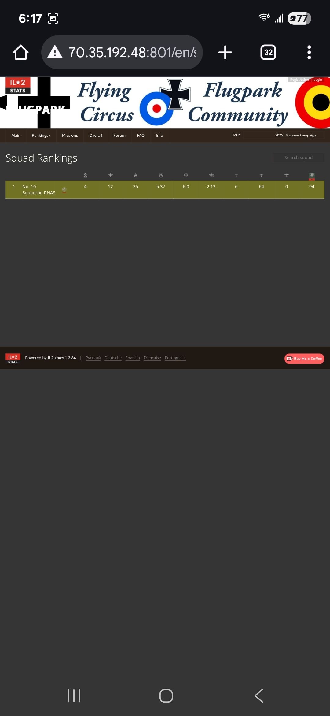 No.10_Ace_Ivo Posted June 29, 2024 Posted June 29, 2024 (edited) Hi @=FB=Vaal, for a while now I'm getting 'server error (500)' when I click on the Albatros D.II stats on IL2 stats. This only happens with the Albatros D.II and another WW1 server is experiencing the same issue. I'm getting the following errors on the console when someone clicks on the Alb D.II stats: 'Message: 'Internal Server Error: %s' Arguments: ('/en/aircraft/3126/NO_FILTER/',)' and 'raise ValueError("Missing staticfiles manifest entry for '%s'" % clean_name) ValueError: Missing staticfiles manifest entry for 'img/aircraft/albatros d.ii.png'. Nevermind, I just fixed it, the images for the Albatros D.II were spelled as 'd.II' but it had to be 'd.ii'. 🙂 Edited June 29, 2024 by No.10_Ace_Ivo 1