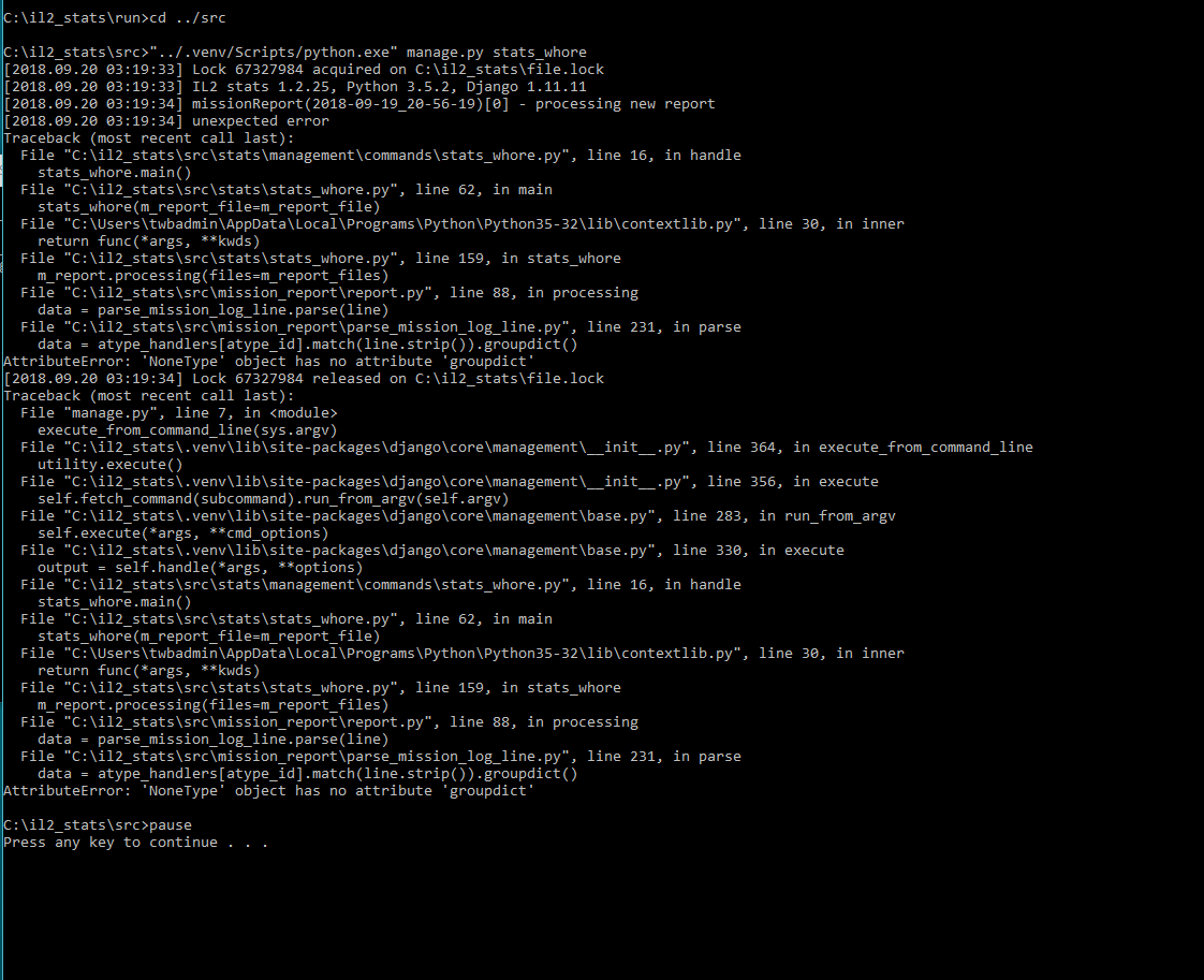 SAS_Storebror Posted July 19, 2018 Posted July 19, 2018 (edited) I'm afraid there's a small glitch in 1.2.23. Just got this error: [2018.07.19 18:15:56] unexpected error Traceback (most recent call last): File "C:\Python3\virtualenvs\il2stat\il2_stats\src\stats\management\commands\stats_whore.py", line 15, in handle stats_whore.main() File "C:\Python3\virtualenvs\il2stat\il2_stats\src\stats\stats_whore.py", line 69, in main online_timestamp = update_online(m_report_files=m_report_files, online_timestamp=online_timestamp) File "C:\Python3\virtualenvs\il2stat\il2_stats\src\stats\online.py", line 24, in update_online data = parse_mission_log_line.parse(line) File "C:\Python3\virtualenvs\il2stat\il2_stats\src\mission_report\parse_mission_log_line.py", line 231, in parse data = atype_handlers[atype_id].match(line.strip()).groupdict() AttributeError: 'NoneType' object has no attribute 'groupdict' [2018.07.19 18:15:56] Lock 2384413112416 released on C:\Python3\virtualenvs\il2stat\il2_stats\file.lock Traceback (most recent call last): File "manage.py", line 7, in <module> execute_from_command_line(sys.argv) File "C:\Python3\virtualenvs\il2stat\il2_stats\.venv\lib\site-packages\django\core\management\__init__.py", line 364, in execute_from_command_line utility.execute() File "C:\Python3\virtualenvs\il2stat\il2_stats\.venv\lib\site-packages\django\core\management\__init__.py", line 356, in execute self.fetch_command(subcommand).run_from_argv(self.argv) File "C:\Python3\virtualenvs\il2stat\il2_stats\.venv\lib\site-packages\django\core\management\base.py", line 283, in run_from_argv self.execute(*args, **cmd_options) File "C:\Python3\virtualenvs\il2stat\il2_stats\.venv\lib\site-packages\django\core\management\base.py", line 330, in execute output = self.handle(*args, **options) File "C:\Python3\virtualenvs\il2stat\il2_stats\src\stats\management\commands\stats_whore.py", line 16, in handle stats_whore.main() File "C:\Python3\virtualenvs\il2stat\il2_stats\src\stats\stats_whore.py", line 70, in main online_timestamp = update_online(m_report_files=m_report_files, online_timestamp=online_timestamp) File "C:\Python3\virtualenvs\il2stat\il2_stats\src\stats\online.py", line 24, in update_online data = parse_mission_log_line.parse(line) File "C:\Python3\virtualenvs\il2stat\il2_stats\src\mission_report\parse_mission_log_line.py", line 231, in parse data = atype_handlers[atype_id].match(line.strip()).groupdict() AttributeError: 'NoneType' object has no attribute 'groupdict' Please find the sample Mission Report files that triggered this error attached to this pos. Cheers! Mike Mission Report 1.2.23.zip Edited July 19, 2018 by SAS_Storebror Mission Report files added