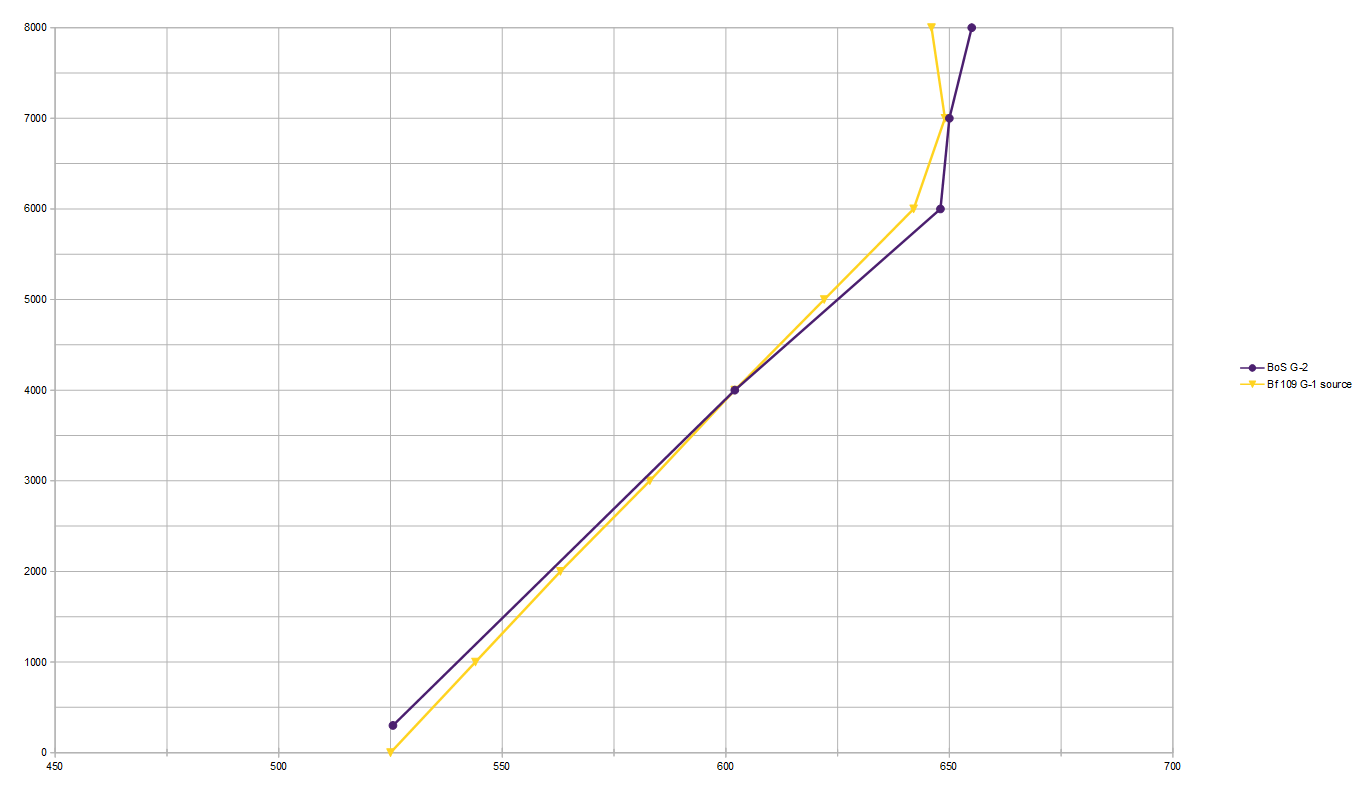6./ZG26_Klaus_Mann Posted December 1, 2015 Author Posted December 1, 2015 (edited) I get it, now. I was wondering why Messerschmitt would downgrade an already good airplane.... The G-2 climbs too slow right now. It should do 21m/s but only ever does 20m/s with closed radiators at low altitude The F-4 should only do 525kph at SL, but does 538, the G-2 does the 535 it should do. The F-4 does 19.5m/s at combat power. So you see how weird it is that the G-2 is exactly at or below spec in top speed, below spec in rate of climb, while the F-4 is far above spec in top speed and just in spec for rate of climb. This is what the climb rate should be for the early G-series, and shows the Top Speed for the late model landing gear which reduced top speed by 12kph. Edited December 1, 2015 by Klaus_Mann