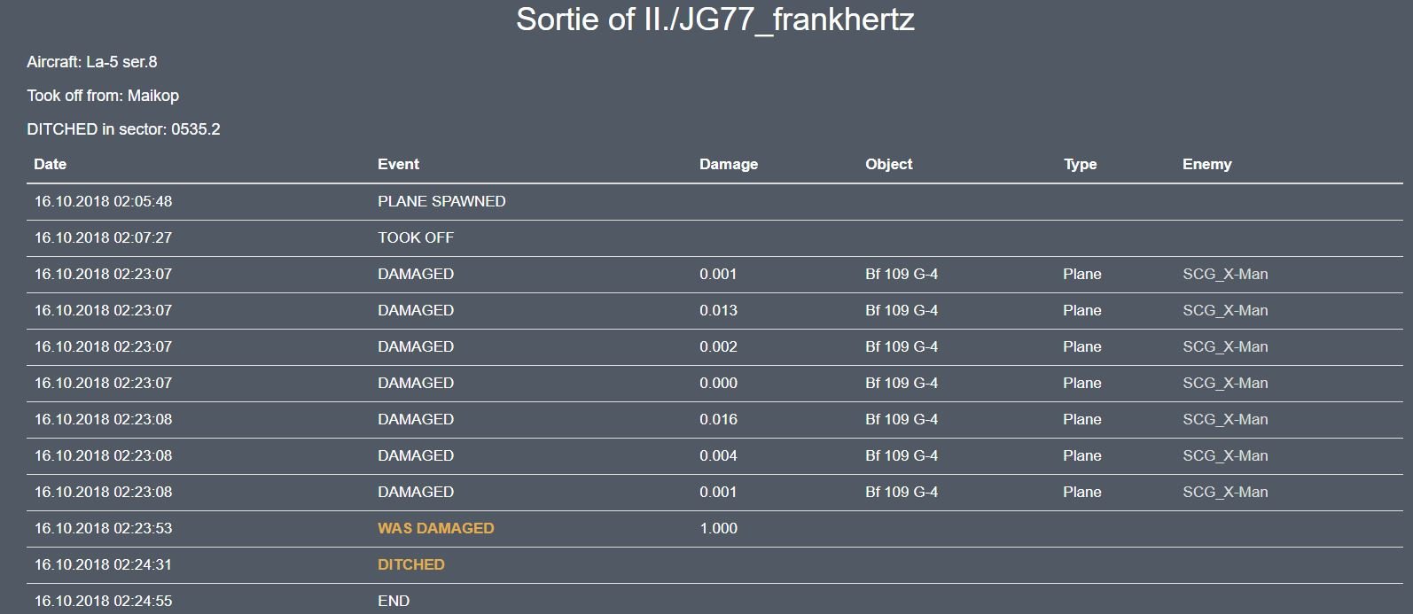 JG7_X-Man Posted October 16, 2018 Posted October 16, 2018 (edited) Question: Not whining because kills don't put food on the table LOL Just wondering - I took off, several minutes later I was jumped by a La-5 and took some hits, managed to turn things around by diving away (...love the G-4). A few high yo-yo's later, I took out his engine on single lucky shot. I few back just to find out - I didn't get the kill. I am a tad confused - His engine seized during the fight (I saw the prop stop spinning after my deflection shot, he was in a dive and I was in a climb). According to the log: 02:23:53 I delivered the kill shot to the aircraft, then he ditched at 02:24:31 about 1 minute and 30 sec later. However no kill was give to me. Even though I landed. Should I not have been awarded the kill? My guess is the categorization of "DITCH" is a little too liberal. Once the tag "Destroyed" has been assigned to an object, the term "Ditch" should no longer be applicable. So this is a programming issue (...if I had to guess). Again - no big deal as this is a labor of love. Note from the crash site - he is indeed b/w friendly and enemy territory. However, if I had to guess, that isn't the issue. Edited October 16, 2018 by SCG_X-Man spelling