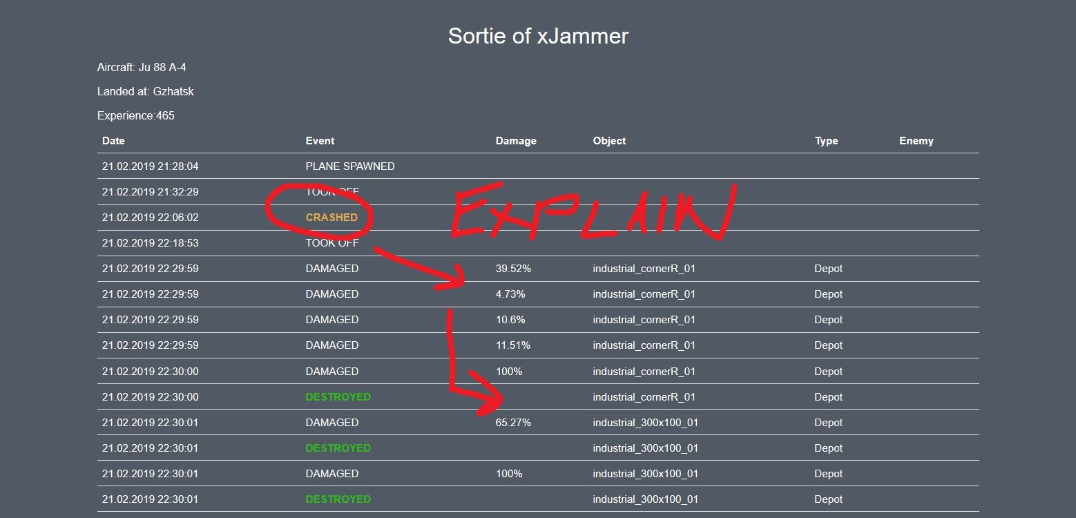 Aap Posted February 22, 2019 Posted February 22, 2019 Where do you guys get that kind of wild ideas that he taxied to a target on the ground? Look at the log, he took off, then it took time to get over target, then he damaged/destroyed several objects at the same second, then again half a minute later, then again half a minute later etc. Looks to me like several passes (dive bombing) with bombs.