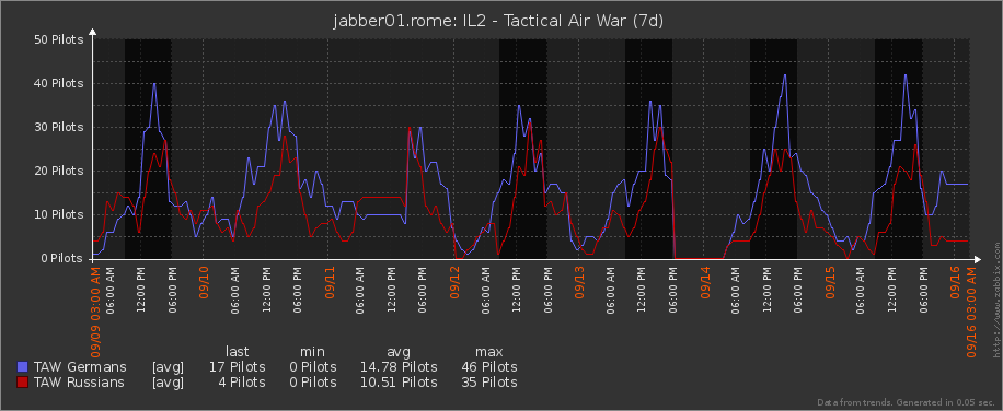 FTC_DerSheriff Posted September 16, 2016 Posted September 16, 2016 Here's the last 7 day trend for reference. Flat lines are when the server is hung. pilots_taw_7d.png yes if I am not mistaking 40% more German pilots on average. But I don't blame anyone. It's just frustrating from time to time not being able to defend everywhere.