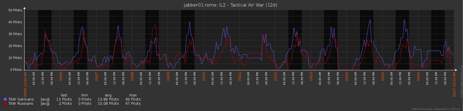 [TWB]Pand Posted September 18, 2016 Posted September 18, 2016 Salute Gents! Final Chart for the entire 12 days of TAW Campaign 2: It appears the Red team was holding on strong keeping the numbers close, and even exceeding it to drive the win on the first frame of this campaign. Once Frame 2 started, Germany pushed full force and it looks like the Red team just stopped showing up up as often (for frame 3 as well). From the chart, average pilots during the full 24 hour play period across the 12 day campaign: Blue Team: 13.86 Red Team: 10.08 Note: Some data is skewed slightly so Blue (and Red) Values are slightly higher thannormal due to server hangs (Represented by two 12-hour-ish flat lines on the chart). A few numbers I'd like to see if anyone has them or a way to extract the data from the server: 1. I'd love to see a comparison of the number of "active players" registered on the Red and Blue teams. (I define "active players" as an average of at least 1 sortie per day of at least 15 minutes or more. So that would be an average of 12 sorties over the course of the entire campaign that last longer than 15 minutes each (or more)... because if you didn't fly at least 15 minutes before loggin' out, you didn't do much to drive the war effort. 2. I'd love to see a comparison of the total flight time hours of "active players" for the Red and Blue teams (same definition of "active players" above). What a fun and amazing Campaign! TWB will alternate coalitions after each campaign, and we all can't wait to fly Red next campaign! Good Hunting Gents! 3