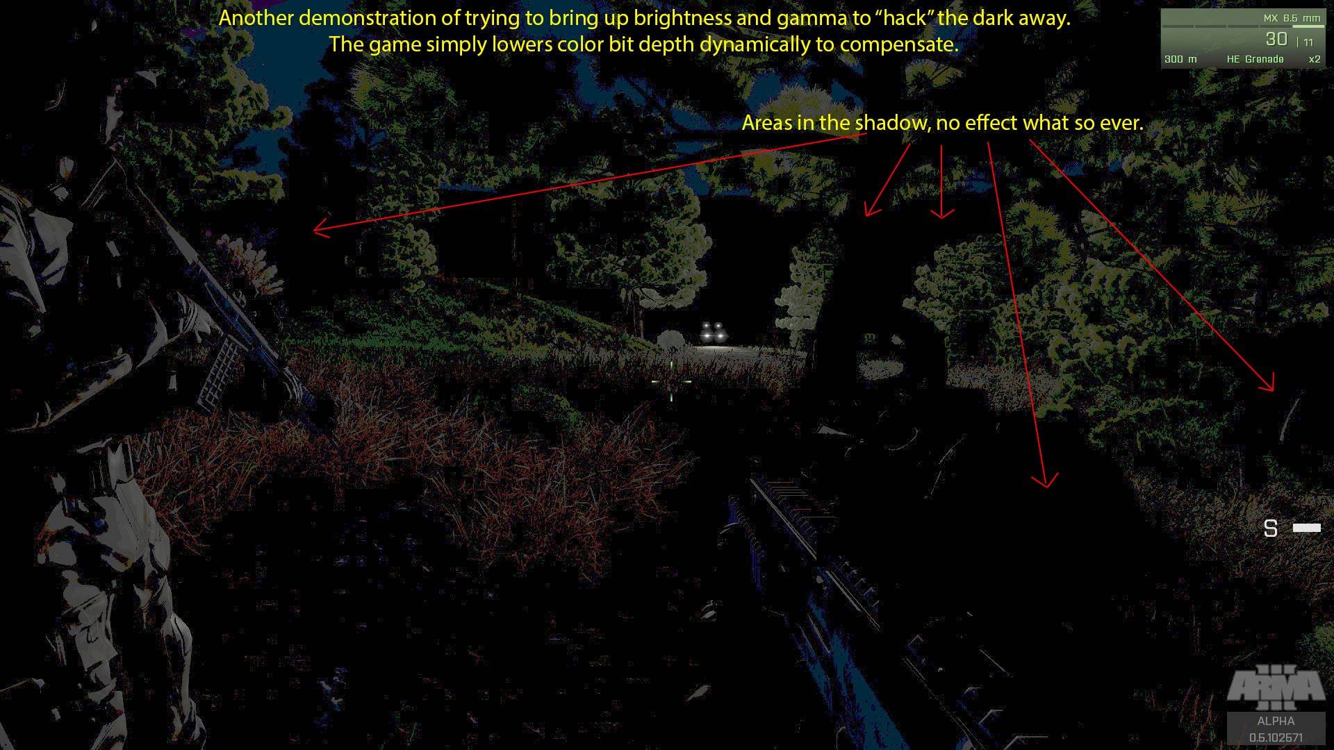 Cpt_Siddy Posted October 21, 2020 Posted October 21, 2020 (edited) I fly in VR with OLED screen and its totally different experience than of LCD. This game handles the luminosity in traditional way, IE, its darken colors, so OLED gives you a distinct advantage over LCD at nigh time, as LCD's use light obstructing elements, while OLED's use emitting elements. This has been long standing problem in many competitive autistic mil sim games and issue that has few solutions, This problem has been solved in games, like ARMA3 where the dark values simply don't send any color data but go in to black and white mode, no ramping up of gamma will help with that. Here is ARMA 3 image with gamma ramped up to 9000 Edited October 21, 2020 by Cpt_Siddy