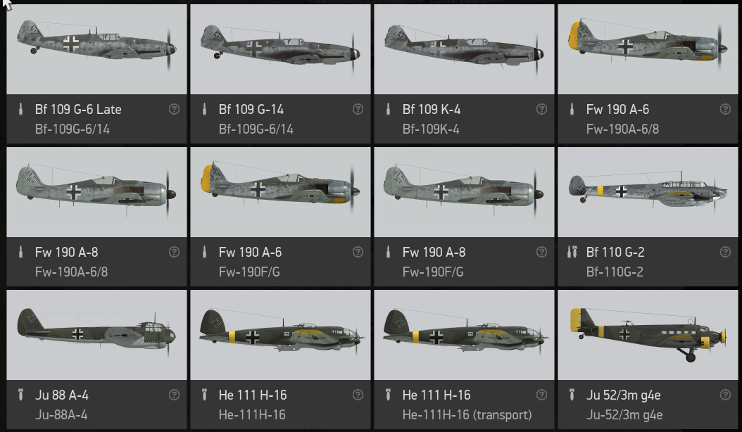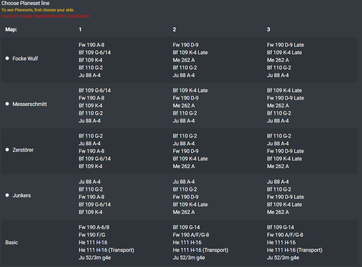 =/Hospiz/=MetalHead Posted September 17, 2021 Posted September 17, 2021 (edited) Okay, some examples to picture how this new planeset works. Let's assume I want to fly the mighty Luftwaffe this season (I am joking, gonna fly red this time :)). There are four lines to choose from: Each line has the same set of planes, but with different replenish order. Since getting them all requires collecting lot of CP and death will take them all away, I must decide, which I need the most so it will can be quickly replenished. Let's say I chose Messerschmitt line, because I love 109s Now, my priority list of advanced aircraft is: Take a note that first aircraft is 1/1. It means that at the start of the map, I will get one plane of this type as a starting bonus. It's not a +1 plane like basics are, so it will not be autoreplenished. Okay, but what planes do I exactly have now? This part is a breakdown of these "slot" names used in previous table. Let's say we start at map #1. So what planes and in what order I get? Remember how the priority goes? Priority list for my line is: Messerschmitt, Focke Wulf, Wunderwaffe, Zerstorer, Junkers So I get respective advanced aircraft: Bf 109 G-6/14, Fw 190 A-8, Bf 109 K-4, Bf 110 G-2, Ju 88 A-4. Had I chose different line, I'd get these aircraft too, but in different order. I also always have basic fighter, fighter-bomber and bomber (Jager, Jabo, Heinkel) and special planes/transports (they count as basics for all rules): So I for the map #1 my basics are: Fw 190 A-6/8, Fw 190F/G, He 111 H-16, He 111 H-16 (Transport). They are replenished after each mission and I won't lose them all in case of death. Take a moment to notice, that regardless of line chosen, Wunderwaffe slot is never first one. It's always third. As a result, getting to these superb planes that occupy it (K-4 for map #1, Me 262 for maps #2 and #3) will never be easy and will take some time. Ok, so I've decided what to choose, I want to register then. On the webpage, during registration process, following table is shown: As you can see, each line lists all these planes for each map sorted by priority for respective line. It uses specific plane names, as a result it's a huge one It wouldn't fit into the planeset graphics so nicely ? Okay, I've registered, chosen my line, now I want to fly. I enter the server, click on the airfield and I see this: (not exactly this, as planes are ordered basic-first in game, this screen comes from my test mission :D) How do I know what is what? There's a lot of Fw 190s with different labels for example ? I've chosen my Messerschmitt line, but for now let's say I want to fly a quick jabo sortie with my basic Fw 190 F/G Here comes the leftmost part of the planeset table: It's detailed description of all planes used in this planeset. With all required/banned modifications and loadouts listed. Fw 190 F/G used in this example is represented in game both by G-3/G-3/R5 modifications of A-6 and F-8/G-8 modification of A-8. Last column gives additional info about loadouts that are present on limited amount of airfields. It's related to depot damage. Planes on the airfields are already named and sorted properly. As you can see, the lower gray name reveals that these two aircraft represent Fw 190 F/G. Upper white name is of course name of ingame model. I've chosen to fly using the A-8 (or call it F-8 to be historically accurate, haha). I have to check if my loadout for this plane contains required F-8/G-8 modification, so I click the loading option screen: By default, some modifications (including required ones) are already loaded, while restriced loadouts are locked on the airfields. However, players are still able to modify them and accidentally change something, so remember to check if your loadout of choice is allowed for this plane. That's all for now. Enjoy new season everyone! Edited September 17, 2021 by =/Hospiz/=MetalHead 1 1 11
