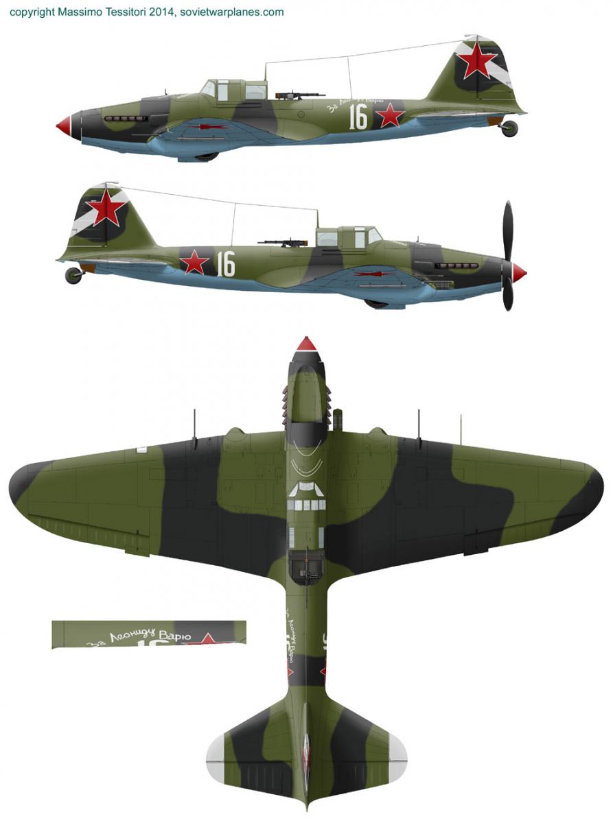 Brano Posted April 19, 2016 Posted April 19, 2016 (edited) This is written on http://mig3.sovietwarplanes.com/il-2/il2-camo/il-2m/il2m-early1943.htm Plane n.16 of 7 Gv.ShAP shows a different position of the white band if compared to the photos of Emelyanenko's plane and white 26 of the same unit: on the tail, instead of around the rear fuselage. The fin/rudder stabilizers/elevators appear with white tips too. The photo includes other three planes flying with 16, including two singleseaters with the oblique band and a twoseater still with partial winter camo. The plane bears an inscription on the left side; it is not readable in these photos, but it is reproduced as 'For Leonid Vyaryu' on a drawing of the Polish monograph Loctnicze on Il-2 and 10. Now, this name isn't present in the records of 7 GvShAP; eventually, if one supposes that the name Leonid is right and the surname is badly read, it could be that of pilot Lieutenant Leonid I. Novak , killed on 26/07/1943, but the inclusion of a winter painted plane suggests that the images were taken in spring 1943, so he hadn't yet been killed at that time. I've excluded Leonid Ivanov, killed in 1944; no other Leonid result in the records. Anyway my drawing is conformal to the Polish drawing, hoping that they had better images of the plane. My theory - those are more probably women names Leonida and Varya,because in genitiv there is Leonid-u,Vary-u which are used only in feminine in russian. Most probably his sisters/mother/girlfriend killed during war. Edited April 19, 2016 by Brano