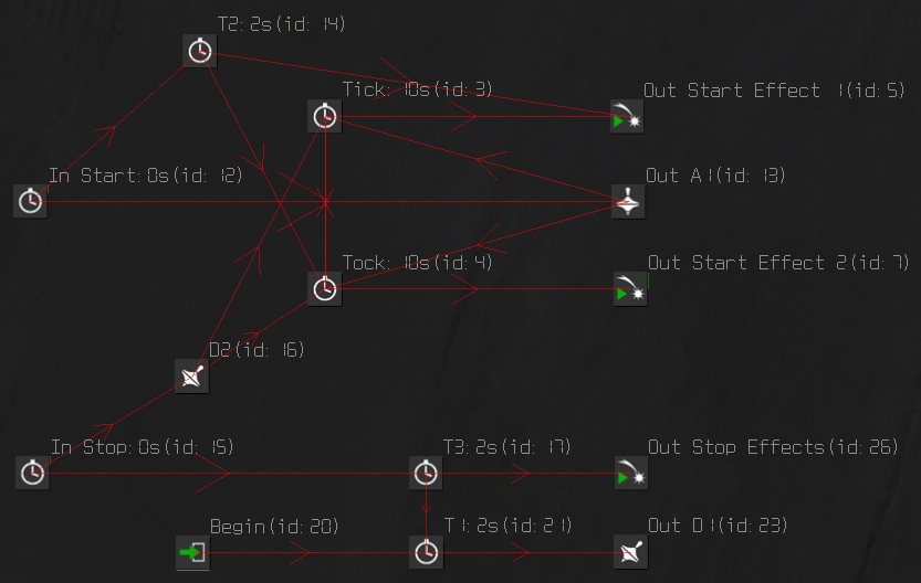 JimTM Posted August 29, 2016 Posted August 29, 2016 (edited) Make Areas Smoke Due to Damage You can make smoke rise from an area that has been damaged. Note: Do not use too many smoke effects because that can use up a lot of mission resources. Do the following: 1. Place the effect object "city_fire", "city_firesmall", or "villagesmoke" on an area that can be damaged and make the effect a linked entity. Note: city_fire is the only effect mentioned here that shows the flames that produce the smoke. 2. Copy the effect object and place the copy right next to the original. 3. Link an effect sustainer (see below) to the effects. 4. Trigger the effect sustainer start and stop functions with target links or message links from other mission elements. Effect Sustainer The effect sustainer allows certain effect objects that have a limited lifespan to run continuously. The following effects have approximately a 16 second lifespan so they require the effect sustainer to run continuously: - city_fire (the smoke disappears after 16 seconds but the fire is permanent) - city_firesmall (this effect is smoke only) - villagesmoke Input - A target link or a message link to "In Start", which starts the effects - A target link or a message link to "In Stop", which stops the effects Output - An object link from "Out Start Effect 1" to the first effect object - An object link from "Out Start Effect 2" to the second effect object - Object links from "Out Stop Effects" to each effect - Object links from "Out A1" to city_fire effect objects (if you use them) - Object links from "Out D1" to city_fire effect objects (if you use them) Description and Usage Notes The effect sustainer requires two copies of an effect placed right next to each other. It starts effect 1, waits 10 seconds, and then starts effect 2 before the lifespan runs out on effect 1. The effect sustainer continues to start each effect at 10 second intervals until it detects a stop request. Here is the effect sustainer: When the mission starts, timer T1 triggers "Out D1", which deactivates the city_fire effects (if you use them). This deactivation is required for the city_fire effect because the fire part of this "smoke-and-fire" effect starts automatically when the mission starts. Note: If you are not using the city_fire effect, you can delete Begin, T1, and "Out D1" The zero-second input timers "In Start" and "In Stop" serve only as connectors into the effect sustainer. The effects are started by a signal to the "In Start" timer, which triggers T2 and "Out A1". "Out A1" activates the Tick and Tock timers. This activation is redundant on the first start but it is required when the effects are stopped and then restarted. Timer T2 waits 2 seconds for Tick and Tock to be activated. It then triggers the Tock timer and "Out Start Effect 1". After 10 seconds, Tock triggers Tick and "Out Start Effect 2". Tick and Tock trigger each other at 10 second intervals to keep effect 1 and effect 2 running. The effects are stopped by a signal to the "In Stop" timer, which triggers D2 to deactivate the Tick and Tock timers. "In Stop" also triggers timer T3, which waits 2 seconds for the deactivation and triggers timer T1 and "Out Stop Effects". As at the beginning of the mission, T1 triggers "Out D1", which deactivates the city_fire effects (if you use them). Edited August 29, 2016 by JimTM 1