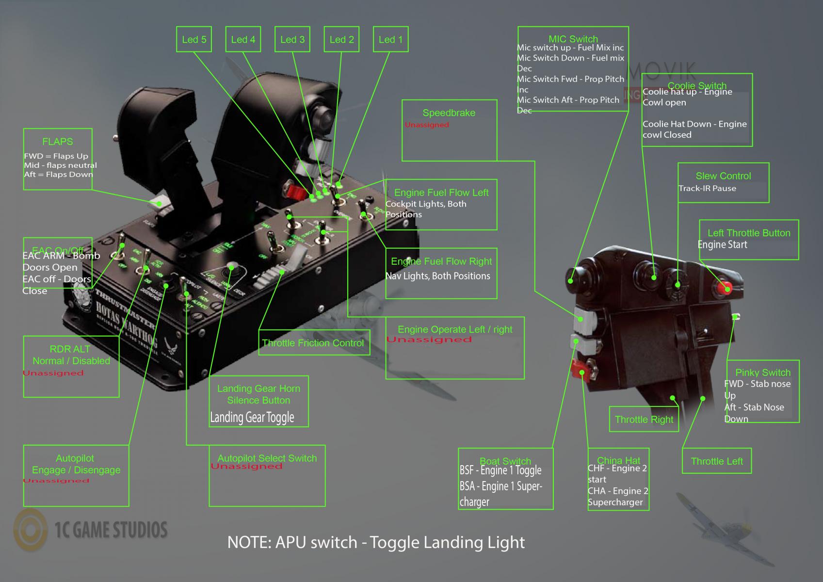 -MG-Cacti4-6 Posted December 26, 2013 Author Posted December 26, 2013 As promised, here is the latest iteration of my script. A few notes: 1) 109 stabilizer movement added to the pinkey switch. switch forward trims the stab to nose the a/c up. aft, trims nose down. There is a bit of a delay when the switch is centered, so it is best to use it briefly. 2) Flaps moved to the flap lever. no flap movement is the center position on the lever, flaps up is...well..the flaps up position on the lever, down is the flaps full down position on the lever. 3) rectified wheel brake/tail wheel lock issue on the DMS hat. 4) rectified bug with bomb/rocket release. Because it was set to pulse rather than a straight key stroke assignment, the game didn't detect the near instantaneous press of the B key. 5) landing light assigned to APU switch. 6) brakes added to main stick, this is intended for Russian birds that dont have differential brakes. Plus i have rudder pedals so i have each wheel brake assigned to those axis's but had nowhere to put the wheel brakes for Russian birds. As usual, below you will find the visual representations of the key stroke assignments, the script can be found here.