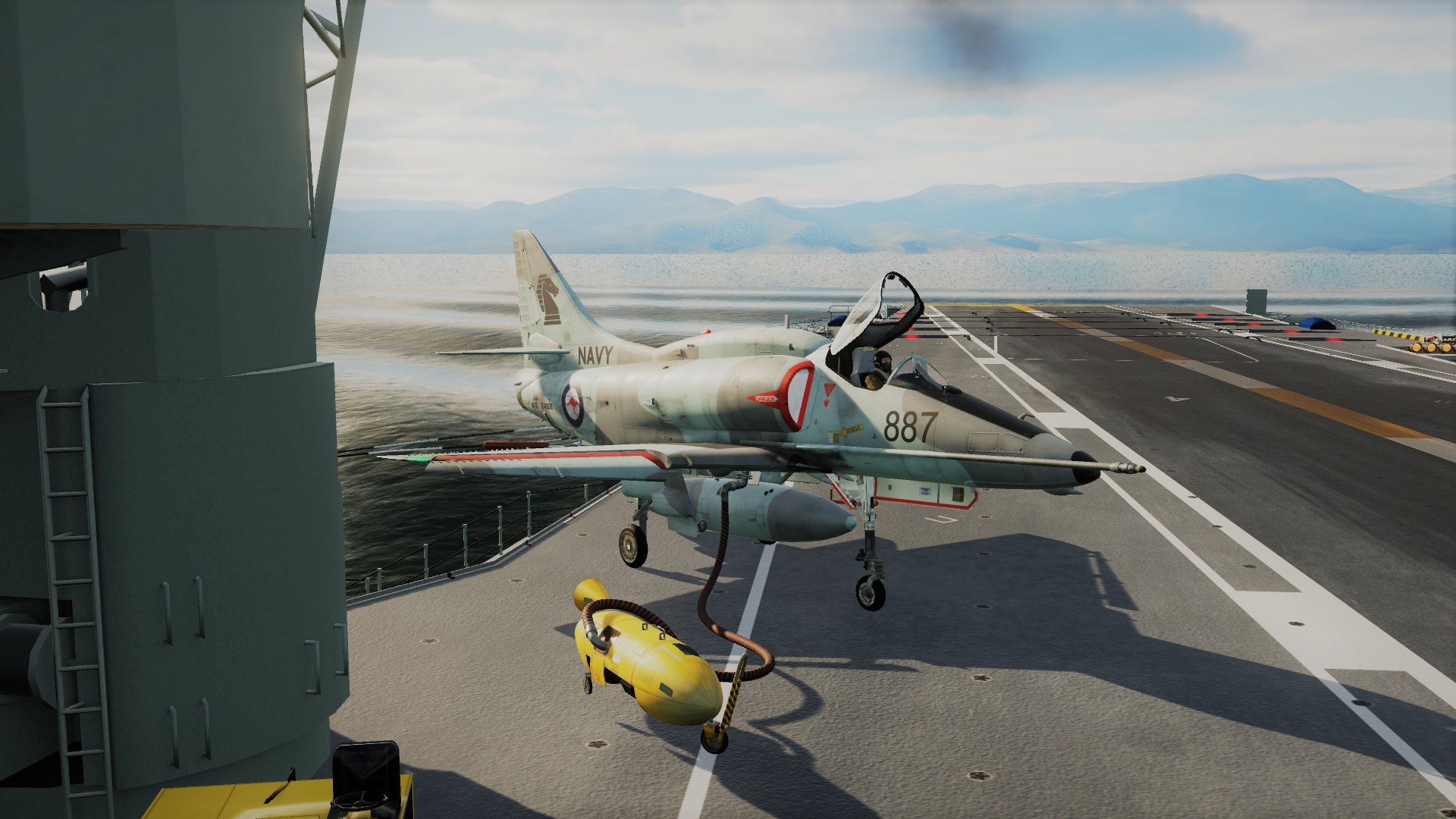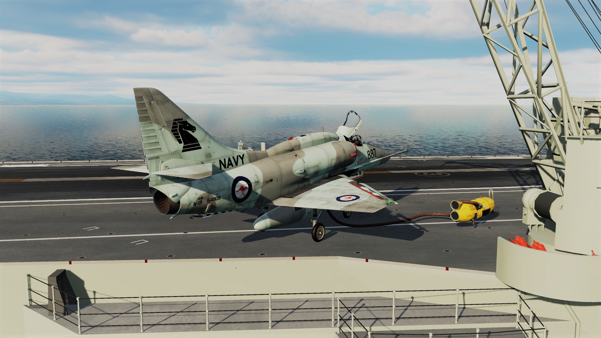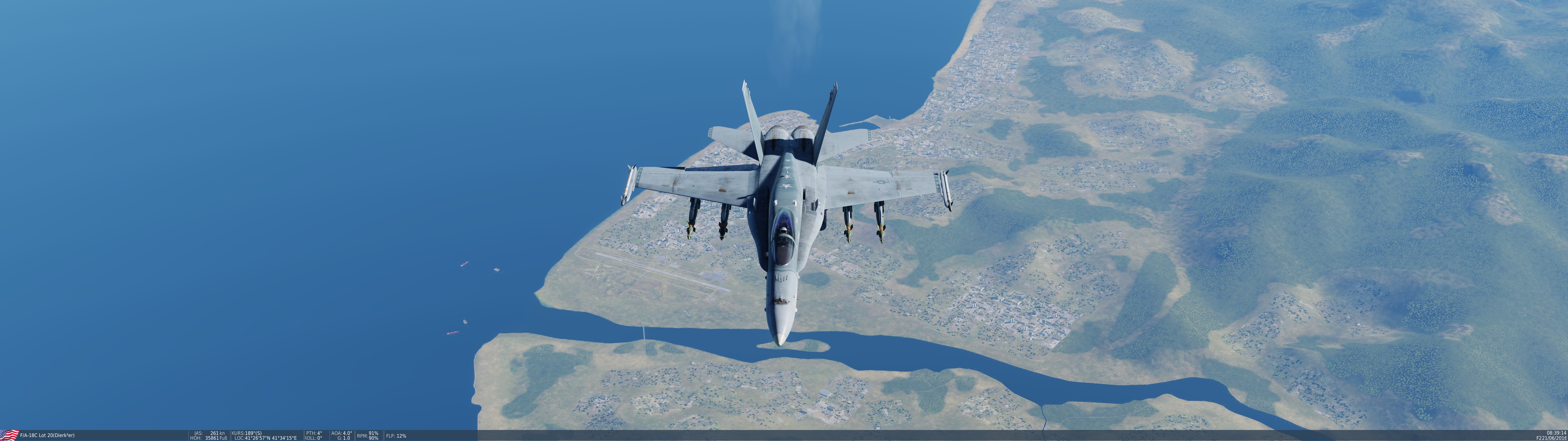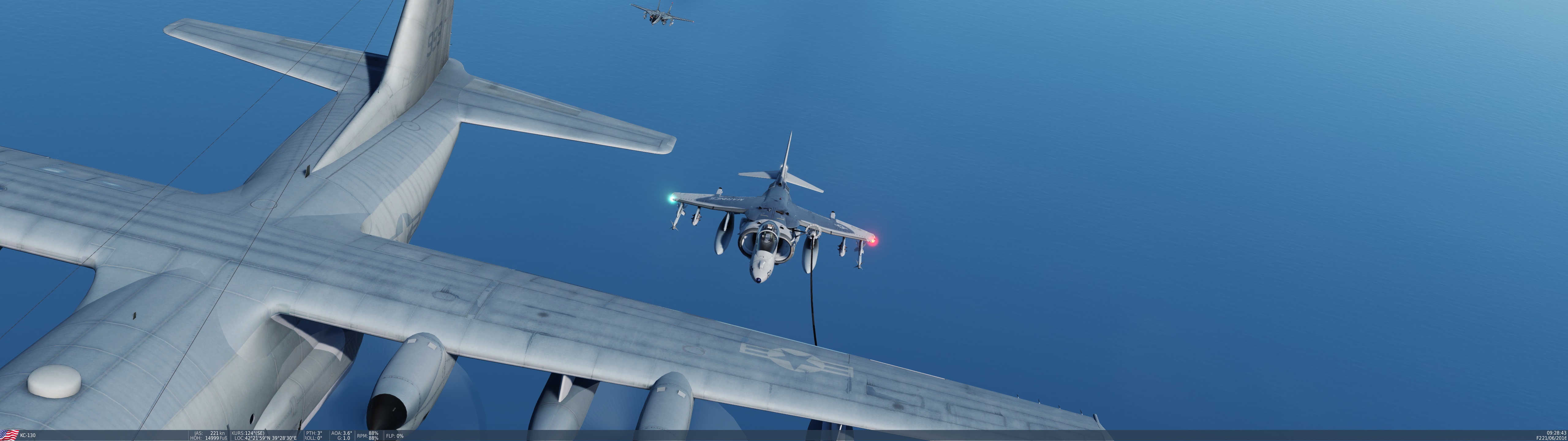 Bremspropeller Posted May 13, 2021 Posted May 13, 2021 Robin fliegt mit Labels Skyhawk auf der HMAS Melbourne - der kleinste Träger auf dem die Scooter jemals eingesetzt wurde. Hier drauf zu landen ist....scary! Die weiße Linie zeigt die Deck Foul Line für die C-2 Tracker an, die ebenfalls auf dem Träger stationiert waren: Völlig krank ? Mit Müh und Not kommt die Kiste von der Piste weg... Tanz, Ania! Meine kleine Farmer... Der sorgsame Umgang mit dem Steuerknüppel ist angeraten, sobald man Außenlasten mitnimmt... Schon eine halbherzige Rolle montiert den Tank an der sich hebenden Tragfläche ab. Der silberne Skin ist mit Sicherheit der beste silberne Skin in ganz DCS. Kurz befor Robin sich wegen Kraftstoffmangels im Felgabschwung üben musste. Mit Sprit-Beuteln lässt sich in der Höhe eine halbwegs anständige Flugdauer bewerkstelligen. Die beiden K-13A Flugkörper wurden später gewinnbringend in dine KC-135 investiert... 2
