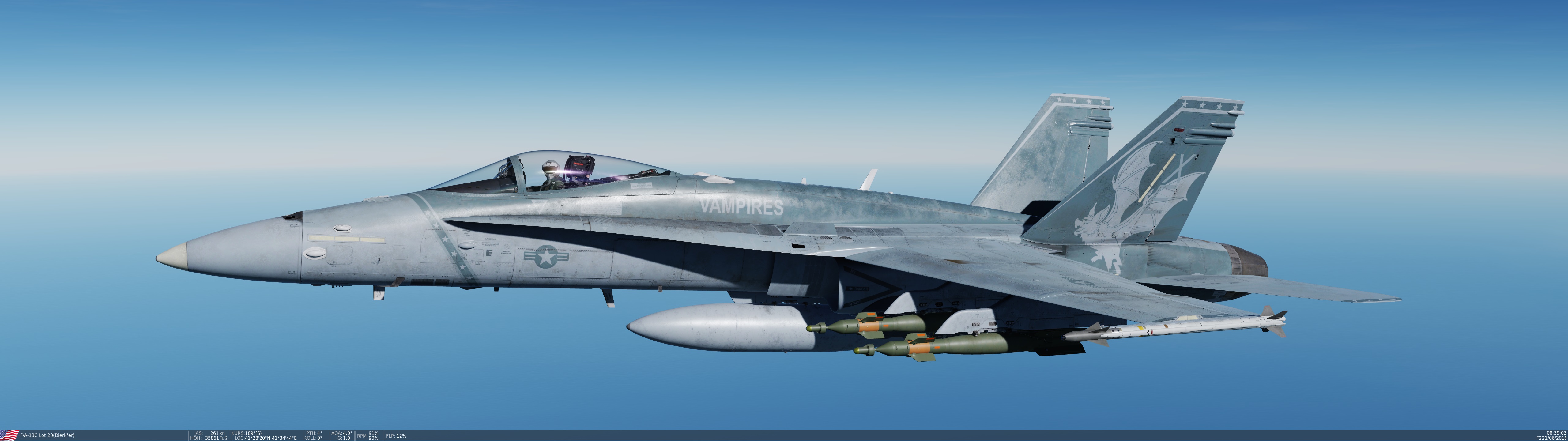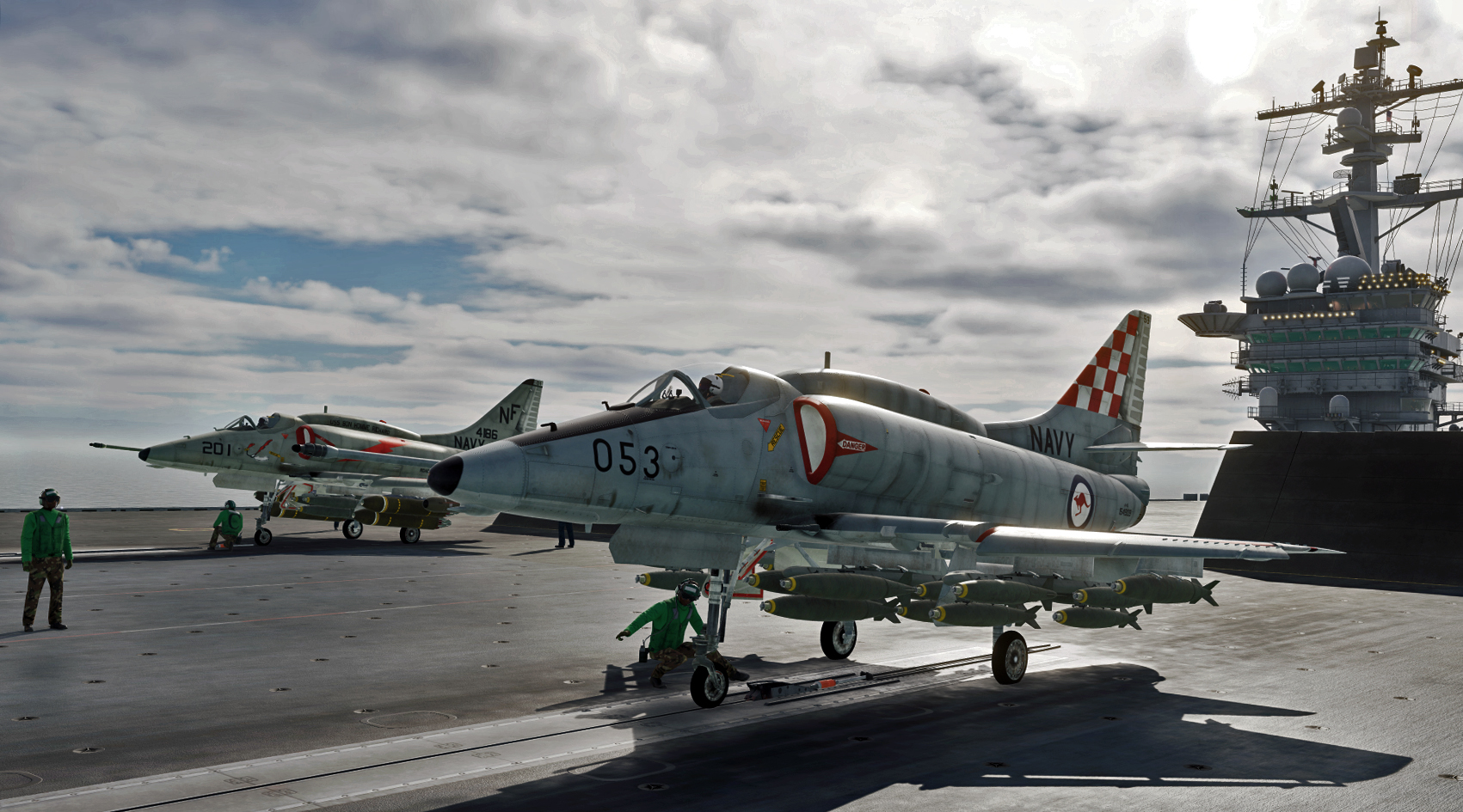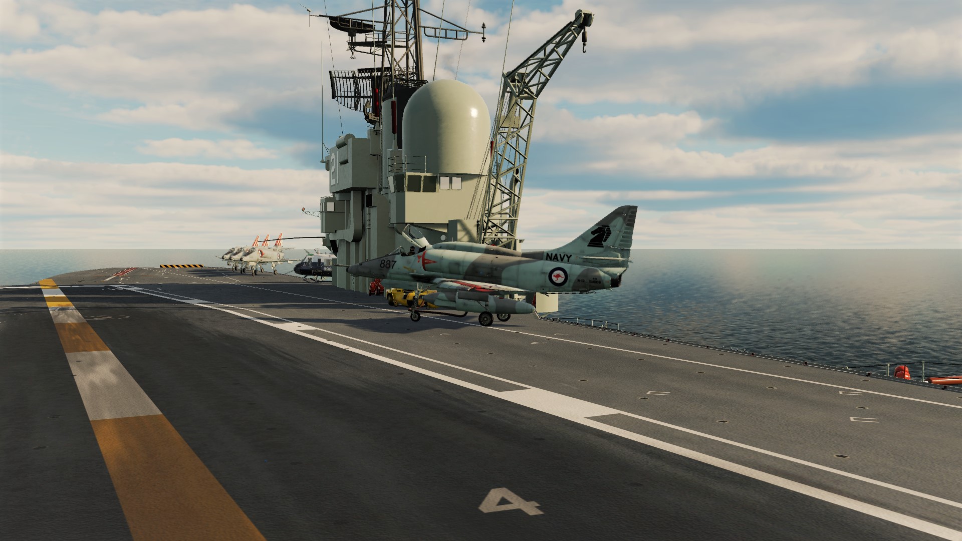 Bremspropeller Posted May 13, 2021 Posted May 13, 2021 Robin fliegt mit Labels Skyhawk auf der HMAS Melbourne - der kleinste Träger auf dem die Scooter jemals eingesetzt wurde. Hier drauf zu landen ist....scary! Die weiße Linie zeigt die Deck Foul Line für die C-2 Tracker an, die ebenfalls auf dem Träger stationiert waren: Völlig krank ? Mit Müh und Not kommt die Kiste von der Piste weg... Tanz, Ania! Meine kleine Farmer... Der sorgsame Umgang mit dem Steuerknüppel ist angeraten, sobald man Außenlasten mitnimmt... Schon eine halbherzige Rolle montiert den Tank an der sich hebenden Tragfläche ab. Der silberne Skin ist mit Sicherheit der beste silberne Skin in ganz DCS. Kurz befor Robin sich wegen Kraftstoffmangels im Felgabschwung üben musste. Mit Sprit-Beuteln lässt sich in der Höhe eine halbwegs anständige Flugdauer bewerkstelligen. Die beiden K-13A Flugkörper wurden später gewinnbringend in dine KC-135 investiert... 2