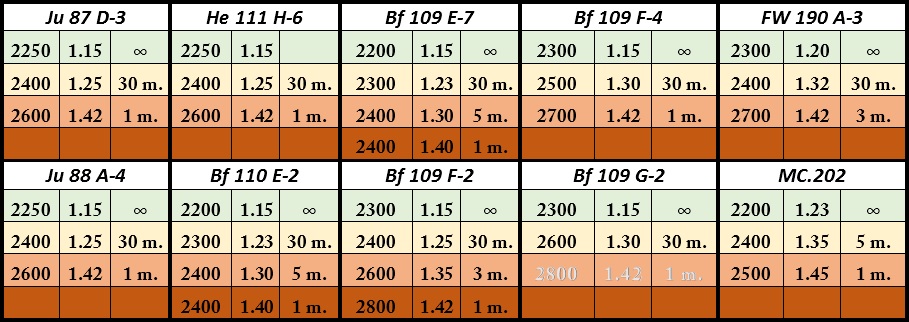 F/JG300_Gruber Posted September 15, 2016 Posted September 15, 2016 (edited) Things I remember is combat power 2200 rpm 30 minutes ... But combat power @2400 rpm is 5 or 10 minutes. Using both boost and combat lowers the time limit. Combat power doesn't mean much if you want to be picky on your engine time. Boosted at 2400rpm, the combat mode runs from 1.28ATA to 1.4ATA, but the 5 min limit is only true at 1.4ATA Just tested that and at 1.30ATA 2400rpm it's 35min until the damaged engine message shows up. Same goes for the other aircrafts. for example, my own testings with the Bf110, all with emergency power (Auto RPM): 1.30 ATA : 4min 40" max 1.32 ATA : 2min 45" max 1.34 ATA : 1min 50" max 1.36 ATA : 1min 25" max 1.38 ATA : 1min 10" max 1.40 ATA : 1min max Tested the Bredas for firing time, and it gives me a solid 34 seconds of fire for both the 7.7 and 12.7 guns (runs out of ammo at 1s interval) Edited September 15, 2016 by F/JG300_Gruber