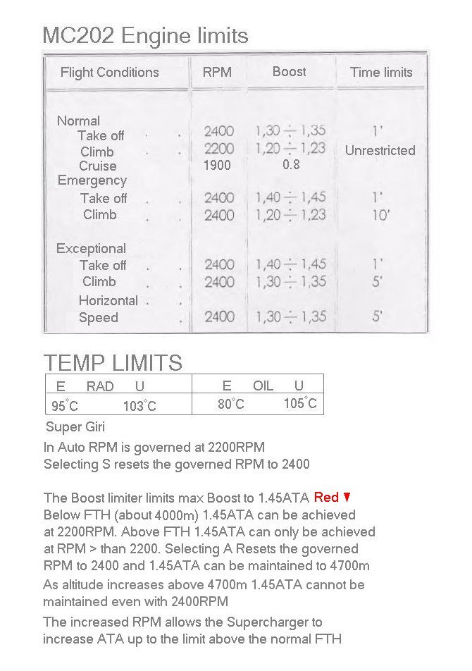 Guest deleted@134347 Posted December 26, 2017 Posted December 26, 2017 You can fly boosted at 80% throttle for around 8-9 minutes. You can also fly boosted at continuous throttle (69%?) for .. i had it for 30 mins or even more.. no problems. But anything above those two introduces too many variables to get a consistent reading. Boost at 100% throttle will give you about 1.5 mins max, so just be aware of that. As far as the rads - keep them at 15-20% or lower (in winter maps). Watch the air temps and open up the rads when it's about ~100C, again, may be up to 50%. The plane itself sheds energy like crazy if you introduce snap rolls, etc. It's useful if you got someone on your six 30 meters away. Otherwise watch your speed, stay at 400kph and you'll get plenty of maneuverability out of it. Any urgent climbs - definitely use boost for those as it keeps the rpm's high, without it the rpms drop like crazy. OK guys thank you very much for all the useful information! I'll try to resurrect this topic for a little bit, as i just started flying this plane. I have a few questions as my experiences so far are very different compared to some of these figures you provided. Basically it feels like the higher rpm and higher manifold pressure settings are almost useless as i get warnings and also actual engine damage very fast. Official specification says 2400 RPM (boost) + 1,35 ata for 5 mins? No way i could fly that much on those settings without engine damage. Gruber posted that 5 min is actually for boost + 1,39..1,40 ata. Also 1,3 ata for 30 mins? Somebody said it will do 485 km/h on SL with just 1,25 ata. In my own tests i just couldn't reach 500 km/h at all (using any power setting, SL) without getting the warnings/damage. The climbrate that i could achieve safely is somewhat disappointing as well, it took over ~2min 10s to get to 3000m, starting from 500m and 400 km/h IAS, compared to the 1min40s i achieved with the 109f-4 (same season, ~same fuel). All of these are with minimal armament and summer map btw. Were your tests also done on the summer map? To be honest the Macchi seems very nice to fly but its performance is a bit disappointing with this fragile engine. Actually i'm almost sure (and i hope) i'm missing a little detail in engine management. Do you have any tips on this?