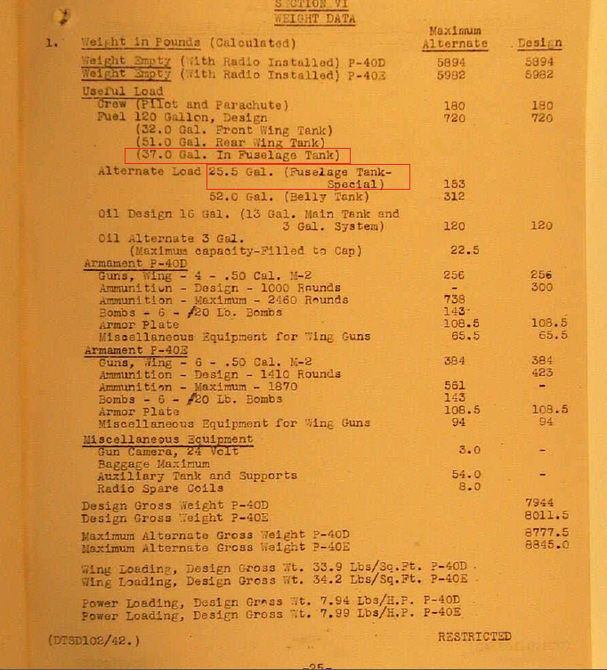 Venturi Posted January 3, 2017 Posted January 3, 2017 There is a P-40 checklist that includes fuel management here, if you wanted to do detailed calculations: http://www.aerofiles.com/checklist-p40.html I found some interesting things out just now. Attached is the relevant page from the USAAF P40E pilot handbook. Empty weight is 5962 lbs for the P40E, or 2704kg! Right now, IL2 dev numbers list empty weight at 6775lbs, or 3073kg! The normal internal max fuel load for the P40E was 120gal of fuel, that included 32gal in the front wing tank, 51gal in the rear wing tanks, and 37gal in the fuselage tank. However, for very long flights, the fuselage tank could be overloaded with an additional 25.5gal for a total of 145.5gal of fuel. The weight for the standard max load for the P40E, aka "the design load" - which included 6 guns, 1410rds of ammunition, and 120gal (454 liters) of fuel. The standard design load with those options was 8011.5lbs. There were additional "options" which could be added to this, up to "the maximum alternate load" - this included things like a 52gal drop tank, extra 25.5gal fuselage tank fuel, 6x 20lb bombs, and extra 460rds of ammo. The maximum alternate load was 8845lbs! The weight for the additional 25.5gal of fuse tank fuel was 153 lbs. So, for 100% fuel in the game (listed as 148gal?), with 6 guns, and 1410rds of ammo, the P40E should weigh 8,164lbs! Right now, it weighs 8,420lbs for "standard load" which I assume means 100% fuel, but who knows, it might be for 120gal of fuel instead! The weight for the optional additional 460rds of .50cal ammunition was 138 lbs, but the IL-2 description says that it is only 38kg or 84lbs! In other words!!! There's a big problem! 1