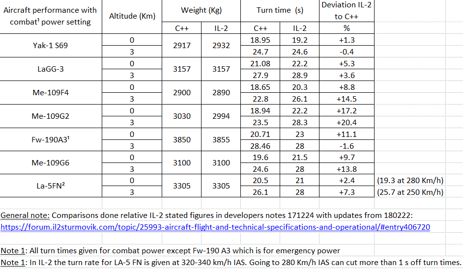 Holtzauge Posted February 24, 2018 Posted February 24, 2018 Added the Me-109G6 and La-5FN to the C++ and BoX turn time comparison table I posted earlier. The figures in the table basically speak for themselves but here are some observations: The G6 is like the G2 underperforming in-game although not by as much as the G2. The developers numbers on the La-5FN are pretty close to the C++ estimate but slightly on the conservative side. However, for some strange reason the La-5FN turn time is given at 320-340 Km/h IAS which is much higher than speed for best turn time which is closer to the 270 Km/h IAS just like for the other planes. Reducing the IAS from 320-340 Km/h to 270 Km/h will reduce the La-5FN turn time with about 1 s so it should be able to turn better in-game if you do this. 2