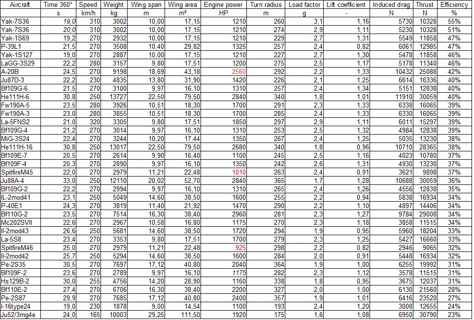 unreasonable Posted March 24, 2018 Posted March 24, 2018 8 hours ago, JtD said: I've updated the original table in the first post. No data has changed, but a couple of new planes are included. My primary issue, the Yak-7 does not make sense at all. By now it looks like there is a different sort of aerodynamics at work as soon as an aircraft is powered by a Klimov. I have included it twice because the devs gave a range of 19-20s for the turn time. It should be noted that this figure is already considerably worse than some data available for the plane, so hats off for not blindly following implausible figures to the very end. I still think it is too optimistic, it definitely is when compared to other aircraft. Some of this is down to an apparent change in FM modelling philosophy, resulting in generally higher efficiencies with newer planes. I just hope they find the time to update the older FM's accordingly. Good news is the A-20 at combat power without bombs has no problem out-turning any German fighter in game at sea level in a sustained turning contest. Can you check the wing area number for the P-39? Wiki says 19.8 not 29.8 and 29.8 makes a mockery of the CLmax calculation- so I suspect a typo in the tech specs rather than a mistake in the game itself.