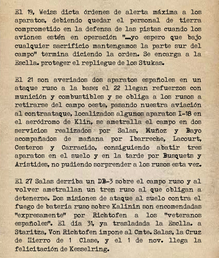 15[Span.]/JG51Costa Posted October 11, 2016 Posted October 11, 2016 (edited) Thank you, Costa. Your little pic has also revealed the location of this ominous "Konaja" airfield - it's Sychevka. I will amend the post for II.(Schlacht)/LG 2 and the one I made for 15.(span)/JG 27 according to your detailed list. Glad it helps. Moshna and Konaja were the most dificult emplacements to find out. Thank you very much, Costa! You did excellent site, I'm very impressed. I want to tell more about 15.(span.)/JG 27 in my next work. So, could you translate to English for me this text from your site? Untitled-1.jpg I can't copy it and use Google Translate. Tx BlackSix for your interest. Do not hesitate to ask anything. Original text: El 19 de Octubre, Weiss dicta órdenes de alerta máxima a los aviones, debiendo quedar el personal de tierra comprometido en la defensa de las pistas cuando los aviones estén en operación "...yo espero que bajo cualquier sacrificio mantengamos la parte sur del campo" termina diciendo la orden. Se encarga a la Escuadrilla. proteger el repliegue de los Stukas. El 21 de Octubre son averiados dos aparatos españoles en un ataque ruso a la base. El 22 de Octubre llegan refuerzos con munición y combustibles y se obliga a los rusos a retirarse del campo oeste, pasando nuestra aviación al contraataque, localizados algunos aparatos I-18 en el aeródromo de Klin, se ametralla el campo en dos servicios realizados por Salas, Muñoz y Bayo acompañados de mañana por Ibarreche, Lacourt, Cesteros y Carracido, consiguiendo abatir tres aparatos en el suelo y en la tarde por Busquets y Arístides,, no pudiendo sorprender a los rusos esta vez. El 27 de Octubre Salas derriba un DB-3 sobre el campo ruso y al volver ametrallan un tren ruso al que obligan a detenerse. Dos misiones de ataque al suelo contra el fuego de batería ruso sobre Kalinin son encomendadas "expresamente" por Richtofen a los "veteranos españoles". El día 31 de Octubre, ya trasladada la Escuadrilla. a Staritza, Von Richtofen impone al Comandante Salas, la Cruz de Hierro de 1ª Clase, y el 1 de Noviembre llega la felicitación de Kesselring. Traslated: On 19 October, Weiss dictates orders of maximum alert to the aircraft, the ground staff is committed to the defense of the tracks when the aircraft are in operation "...I hope that under any sacrifice we maintain the southern part of the field" ends by saying the order. It instructs the squad. Protect the redeployment of the Stuka. On 21 October are damaged two Spanish planes in a Russian attack to the base. On 22 October reinforcements arrive with ammunition and fuel and undertakes to the Russians to withdraw from the west field, passing our aviation to the counterattack, located some I-18 planes at the aerodrome of Klin, is strafed the field in two missions performed by Salas, Muñoz and Bayo accompanied by morning by Ibarreche, Lacourt, Cesteros and Carracido, achieving the destrucción of three planes in the ground and in the early afternoon by Busquets and Arístides, not being able to surprise the Russians this time. On 27 October Salas demolish a DB-3 on the Russian field and in the way home strafe a Russian train that force it to stop. Two missions of ground attack against Russian AAA battery on Kalinin are entrusted "expressly" by Richthofen to "Spanish veterans". On 31 October, already transferred the Squadron to Staritza, Von Richthofen imposes to the Commander Salas, the Iron Cross 1st Class, and 1st November arrives the congratulations of Kesselring. Please, if some one with better English than me found a mistake, please correct me. Saludos 15(Span.)/JG51 Costa Edited October 11, 2016 by 15[Span.]/JG51Costa 1
