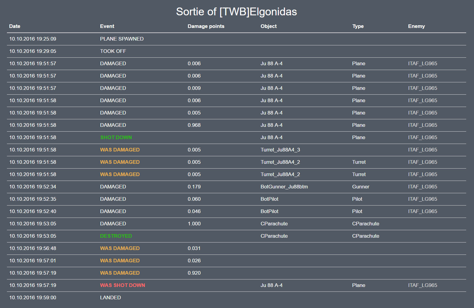ITAF_LG965 Posted October 10, 2016 Posted October 10, 2016 In this case "the gentleman"="the chutekiller" view stats here http://taw.stg2.de/pilot_sortie.php?id=18952&name=[TWB]Elgonidas and follow the timeline, this is intentional! Cheers! 1