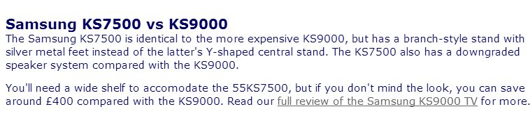 Avyx Posted January 1, 2017 Author Posted January 1, 2017 (edited) What do you think about this one ? http://www.s21.com/samsung-ue55ks7500.htm I couldn't find some reviews on Rtings.com about Samsung KS7500 The input lag in game mode is 21 ms, the JS9090 is 23 ms, so they should be the same on input lag Samsung UE55KS7500 is cheaper than UE55KS9090 with about 900 euro Do you think that KS7500 would be the same or better than my JS9090 ?? Here is a review about JS9000 on rtings.com http://www.rtings.com/tv/reviews/samsung/js9000 Thank you LE : i'm very confused with Samsung KU vs KS Are they the same model ? Edited January 1, 2017 by Avyx