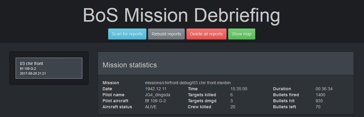 JG4_dingsda Posted November 9, 2017 Author Posted November 9, 2017 (edited) Ok, here we go. Yet again it took me a while to get back to this campaign, but I really would like for it to work out. I have to admit that this getting a little frustating for me -- probably still less frustrating than trying to fly this and not being able to advance. But maybe we can get to the core of the problem together. If things go wrong it usually looks like so: Result is N/A and flight time zero. What actually happened can be seen, if you run the log file through Lupanders Mission parser: Pretty much the result, I'd expect And even though I ended this flight sound and save at my homeairfield, in the ingame flight-log this mission ends as soon as OnPlaneDestroyed is triggered for the first time. [That is why you can trigger mission success by just starting and landing again immediately.] In Veteran's missions OnPlaneDestroyed is connected to a lot of things, not only media, but to a system to give some feedback after the flight as well (in a time when there was no ingame-flightlog). I thought deleting this would solve the problem, but, alas, it did not. So, back to debugging I went and found out, that there is a fourth neutral country involved in the missions besides the default countries (Neutral, Russia, Germany). Deleting the scoring logic and restoring the default set of countries resulted in the only mission I was not able to break ... yet. Chir Front Mission 2.zip But this is still not the end: I started reworking the following missions in the same manner -- they did not work. Back in the mission editor I learned, that restoring the default countries seems to delete the properties of some objects (which ones -- I don't know, but I could clearly see it by missing subtitles). Now I am not sure, whether I avoided a bug that is present in the mission editor while rebuilding the above mission or just because I was not able to break the mission while testing it yet... How you can help: Try this mission out; try to break it. You should still have the campaign installed, because the mission references the media data in the campaign folder, which I did not want to include here because it is too big. This one goes into the mission folder, not the campaign folder. If you are able to break it, let me know (and maybe include flightlog screenshots like I did them myself above). I hope we can solve this, dingsda postscriptum 1: There might be two bugs involved here as well: a) The ingame flightlog not being able to handle other than the default set of countries. b) The mission-editor not being able to restore the default set of countries. postscriptum 2: @Veteran: Should you see this and still know what you used that fourth country for, it would be nice if you'd let me know. Maybe I can weasel around what seems like a bug. Edited November 9, 2017 by JG4_dingsda