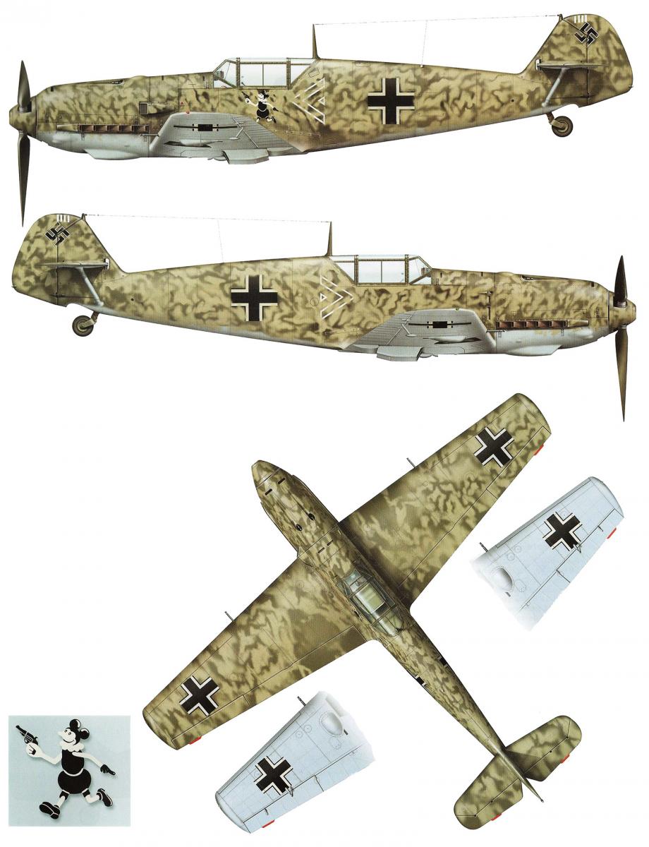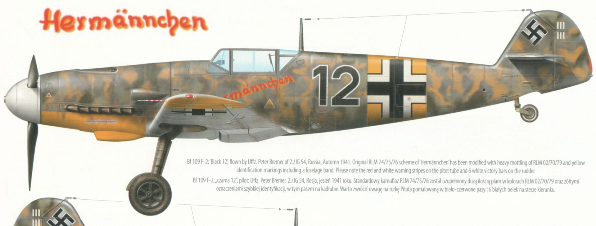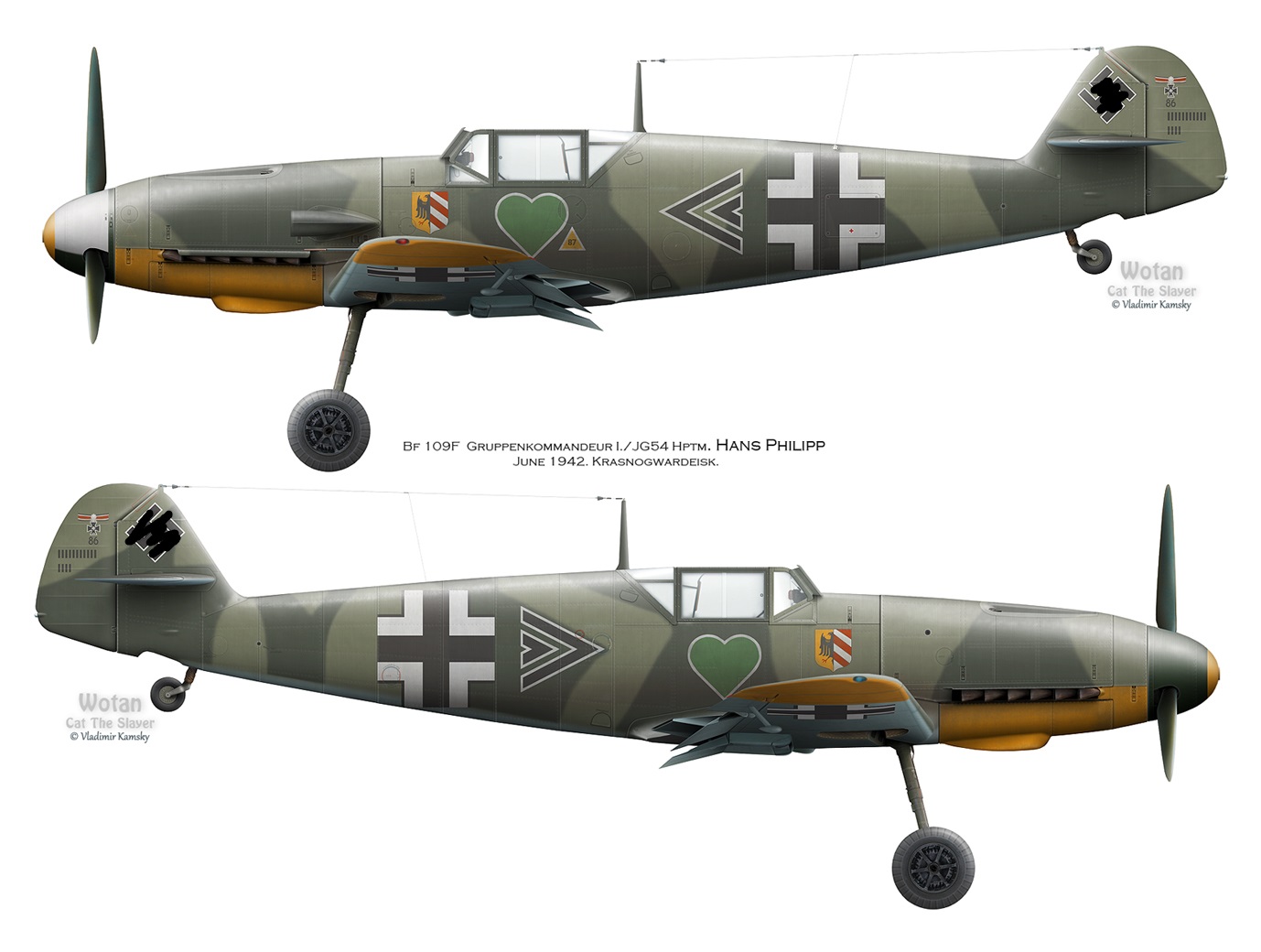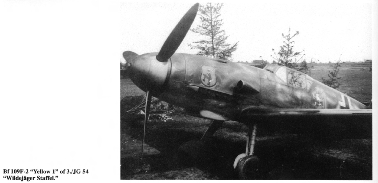 707shap_Srbin Posted August 13, 2017 Posted August 13, 2017 (edited) Now, Bf109F-2. There are 3 main phases: spring-summer-autumn 1941, when I./JG54 was not yet officially called "Green Heart". Also, it didnt adopted Nurnburg emblem untill december 1941. Bf109F-2's of Gruppe weared very unique camouflage, consisted of large squaggles/snakes of RLM02 and RLM71 over fuselage. Stab I./JG 54 1./JG 54 2./JG 54 3./JG 54 Then, soviet winter came down. Also, on 4th December 1941, JG 54 was officially declared as "Grren Heart Geschwader". Grunherz finally appeared on all aircrafts. Bf109F-2's got overall winter camouflage. Stab I./JG 54 1./JG 54 2./JG 54 3./JG 54 Then, during spring 1942, I./JG 54 Bf109F-2's got absolutely mad camouflage - "anti-wave" Winter white was dissolved with fabric piece, to make "old gray-green" visible under winter white. Stab I./JG 54 No photo yet 1./JG 54 No photo yet 2./JG 54 3./JG 54 In late spring 1942, I./JG54 start to recieve new Bf109F-4's and re-equip STaffel after Staffel. Seems, all aviable Bf109F-2 were transferred to 3./JG54, wich was the last to have Bf109F-4's. In this time, JG 54 finally got it's famous green camouflage for all Bf109F-2's and F-4's. Bf109F-2 of 3./JG54, may-june 1942. Edited August 13, 2017 by I./ZG1_Panzerbar