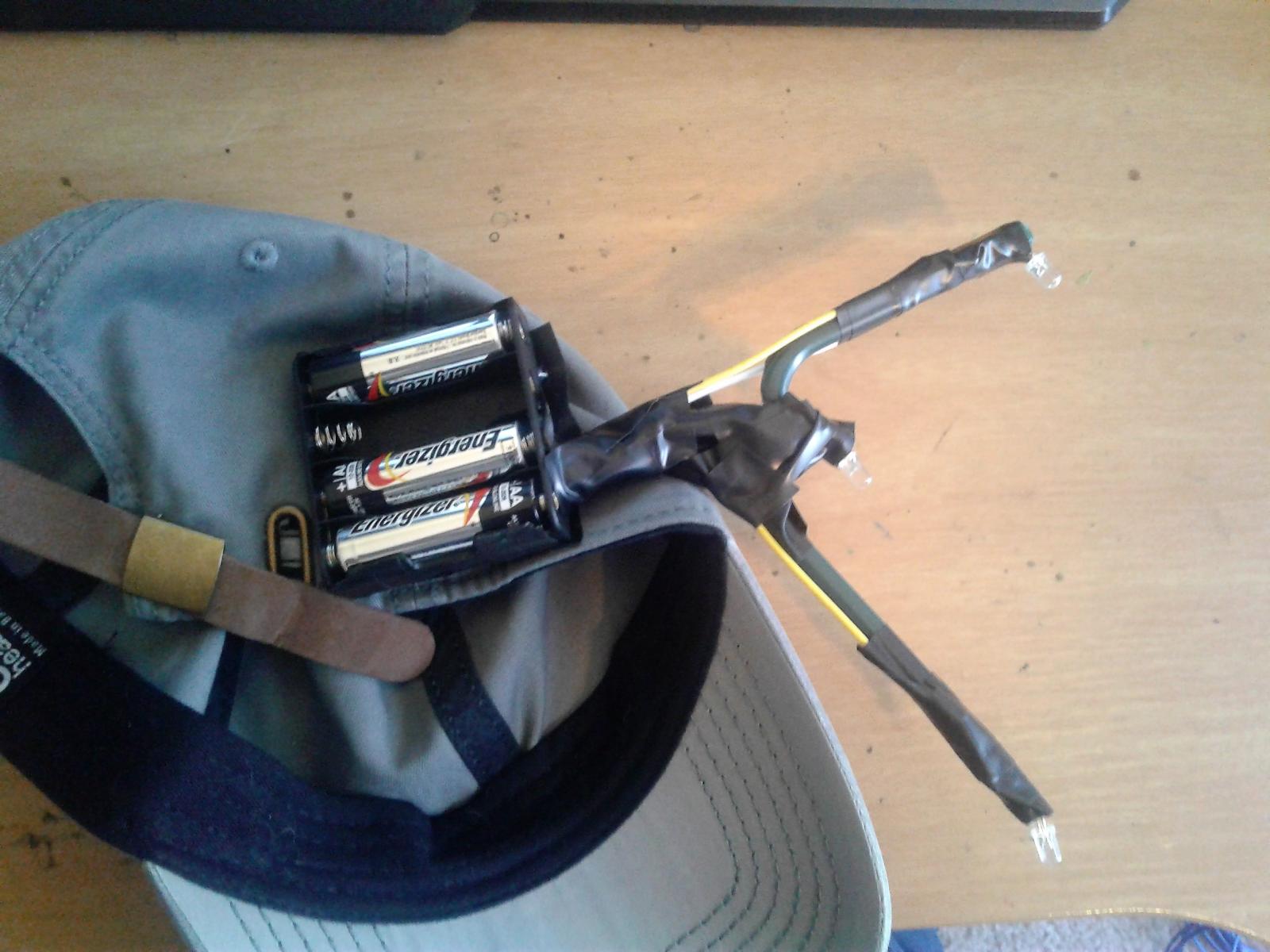 Afterwards, wire up the LED's, (test to make sure they work!), solder (or tape) all of the connections, and tape them down with electrtical tape. Connect the positive and negative to the battery pack. To keep the battery pack from yanking the wires or anything, I put a solid piece of wire (enough to hold the battery pack) between the pack and the middle piece of coat hanger. That kept the pack from slacking and pulling on any of the wiring.