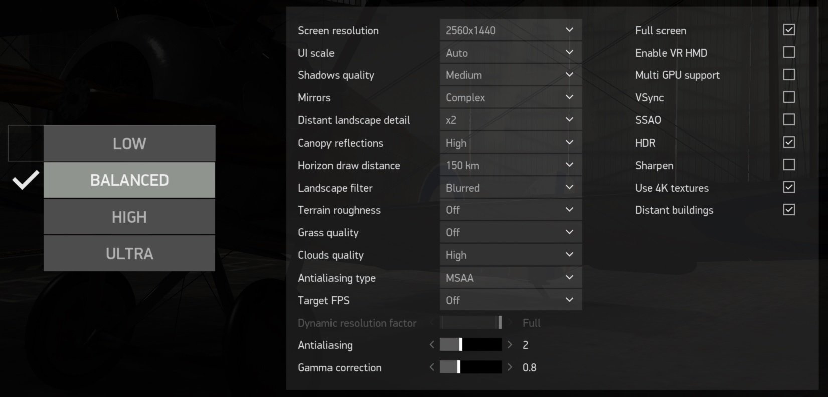 Customizer171 Posted November 6, 2021 Posted November 6, 2021 17 hours ago, Alonzo said: 1 & 2 are the same thing. Here's my startup.cfg graphic config. [KEY = graphics] 3dhud = 0 adapter = 0 bloom_enable = 0 canopy_ref = 0 desktop_center = 1 detail_rt_res = 1024 draw_distance = 0.54500 far_blocks = 1 fps_counter = 0 fps_limit = 0 full_height = 1024 full_width = 1280 fullscreen = 0 gamma = 0.80000 grass_distance = 0.00000 hdr_enable = 0 land_anisotropy = 1 land_detail = 0 land_tex_lods = 3 max_cache_res = 1 max_clouds_quality = 2 mgpu_compatible = 0 mirrors = 1 msaa = 0 multisampling = 0 or_ca = 0.00359 or_dummy = 0 or_enable = 1 or_height = 2167 or_hud_rad = 1.50000 or_hud_size = 0.75000 or_ipd = 0.06667 or_sipdc = 0.00000 or_width = 2214 post_sharpen = 0 preset = 2 prop_blur_max_rpm_for_vr = 155 rescale_target = 1.00000 shadows_quality = 4 ssao_enable = 0 stereo_dof = 5.00000 vsync = 0 win_height = 900 win_width = 1600 [END] 3 looks like this { "fsr": { // enable AMD FidelityFX Super Resolution "enabled": true, // Per-dimension render scale. If <1, will lower the game's render resolution // accordingly and afterwards upscale to the "native" resolution set in SteamVR. // If >1, the game will render at its "native" resolution, and afterwards the // image is upscaled to a higher resolution as per the given value. // If =1, effectively disables upsampling, but you'll still get the sharpening stage. // AMD presets: // Ultra Quality => 0.77 // Quality => 0.67 // Balanced => 0.59 // Performance => 0.50 "renderScale": 0.7, // tune sharpness, values range from 0 to 1 "sharpness": 0.67, // Only apply FSR to the given radius around the center of the image. // Anything outside this radius is upscaled by simple bilinear filtering, // which is cheaper and thus saves a bit of performance. Due to the design // of current HMD lenses, you can experiment with fairly small radii and may // still not see a noticeable difference. // Sensible values probably lie somewhere between [0.2, 1.0]. However, note // that, since the image is not spheric, even a value of 1.0 technically still // skips some pixels in the corner of the image, so if you want to completely // disable this optimization, you can choose a value of 2. // IMPORTANT: if you face issues like the view appearing offset or mismatched // between the eyes, turn this optimization off by setting the value to 2.0 "radius": 0.4, // if enabled, applies a negative LOD bias to texture MIP levels // should theoretically improve texture detail in the upscaled image // IMPORTANT: if you experience issues with rendering like disappearing // textures or strange patterns in the rendering, try turning this off // by setting the value to false. "applyMIPBias": false, // If enabled, will visualize the radius to which FSR is applied. // Will also periodically log the GPU cost for applying FSR in the // current configuration. "debugMode": false } } 4 is basically just what Fenris suggests in the thread - 100% resolution in SteamVR, that advanced resample filtering thing off, and for my system I disable reprojection, I prefer occasional frame drops instead of the system dropping down to 45 FPS all the time. And for NVidia control panel, I strongly advise people to leave everything at the default except power mode, which should be "prefer maximum performance." I've seen a lot of threads where people claimed speedups from messing with the mipmaps, filtering, pre-rendered frames and all sorts and I have never measured an actual improvement. So I leave all that stuff vanilla except for the power preference. You might get a benefit from switching on the ultra-low latency VR mode in NVidia control panel, but again it's not actually measurable in terms of FPS improvement. Thank you very much! I thought 1 and 2 was different settings, lol. No wonder I was confused by all of this! Now I have better quality but it is still not great. I must say that I have some doubts if VR is for me, SOO MUCH tweaking and I also get a very strange dizzy feeling when I fly in VR. Today I tried to play in 2d instead and it was amazing how clear and smooth everything was. The immersion was not as in VR but everything else was much better. I will not give up yet but if I cant get used to this soon I will probably go back to 2d. Once again, thank you for your time and advices, I really appreciate it. 1