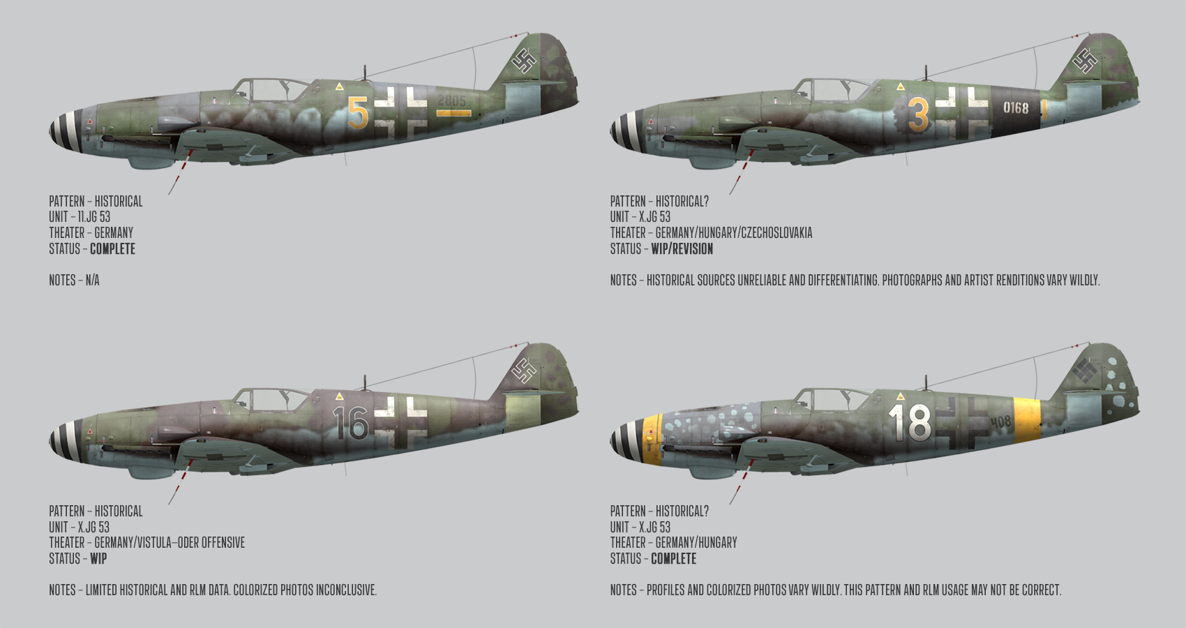 DetCord12B Posted May 16, 2021 Author Posted May 16, 2021 (edited) Long time no update. I was thankfully pointed in the right direction from Russian and Czech members of the warrelics.eu forum, both of which provided a stunning plethora of information and imagery regarding these liveries, pointing out inconsistencies and incorrect markings. Both of these guys are verified to have worked on the Airbus Bf 109 G4 restoration as SME's. Spoiler On 4/9/2021 at 3:16 AM, sevenless said: Excellent job on the JG 53 liveries, as always. As a native german speaker, I almost spilled my coffee after reading that sentence above. LOL! ? BTW: the "Über-word" is correctly spelled with "ck" instead of "kk" ? But it's hilarious. EDIT - If anyone has any personal requests for the 109 now is the time to make them as this has shifted from a JG53 project to a amalgamation. Edited May 16, 2021 by DetCord12B 5