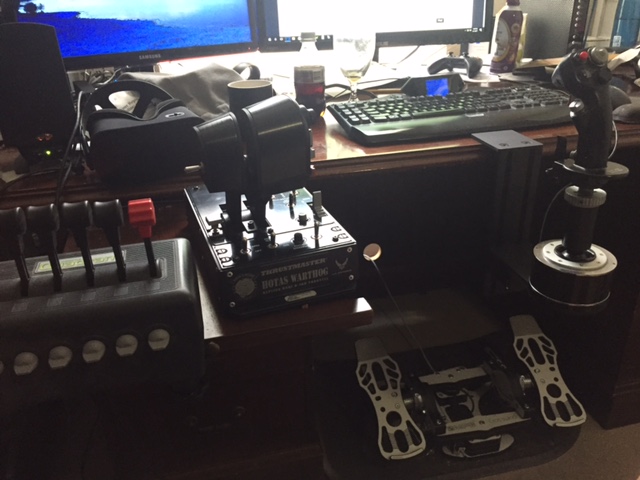 dburne Posted August 1, 2017 Author Posted August 1, 2017 (edited) Looking nice, but ... assuming your desktop has a standard-height of around 75 cm and you're using a kind of standard-chair, too - is the joystick still at a comfortable height? Where do you place the throttle grip, still at the desk? Yes, it is a very comfortable height - plus it cab be adjusted up and down by several inches as well for personal preference. They make a Warthog Throttle Mount as well, however I did not get that. My desk on each side has a slide out flat panel, so I use the one on the left for my throttle. Works pretty good for me. It is the same distance back as my joystick so feels very natural. The throttle is a little higher than the stick, but does not seem to bother me. I also have a CH Throttle Quadrant on that same panel with my Warthog Throttle. Edited August 1, 2017 by dburne 1