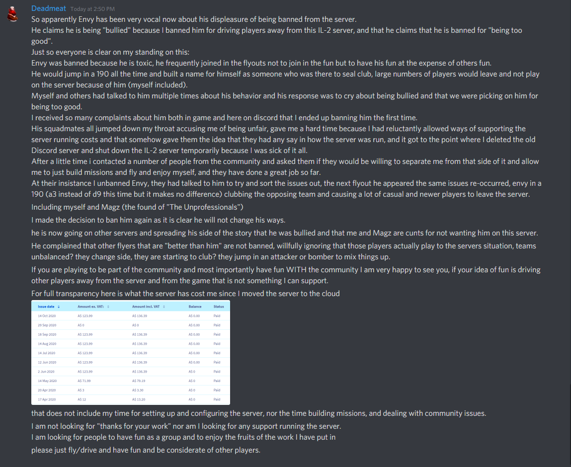 DeadMeat0383 Posted November 1, 2020 Author Posted November 1, 2020 I have been passed screenshots by people of someone who has been badmouthing me and the server in some communities. I really can't be bothered repeating myself and getting misunderstood in multiple community servers so I am posting this here for reference. 1
