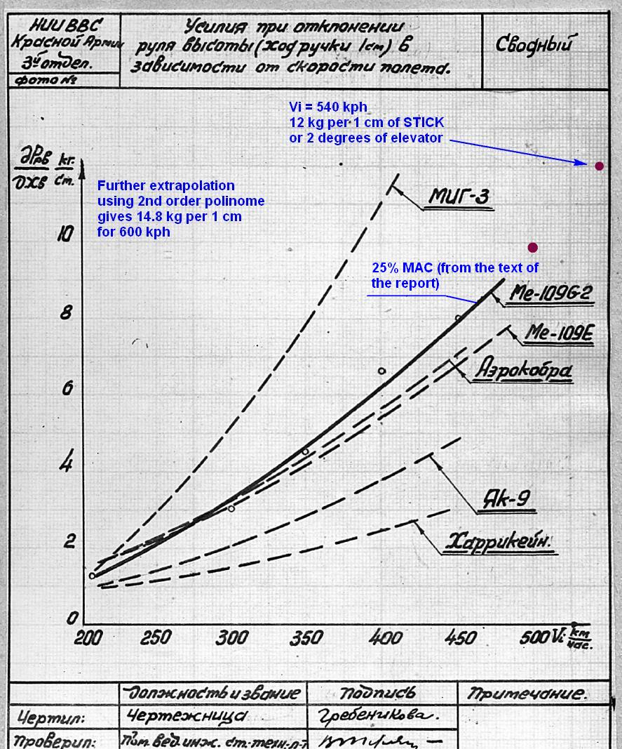 JtD Posted November 4, 2018 Posted November 4, 2018 In the most recent topic on the issue Kwiatek linked a post to the DCS forums, which contained some info on the manner. It takes a look at a German test chart and the Soviet trial of a Bf109G-2. Where the extensive Soviet information would need to be extrapolated (and can be), the German, less extensive German chart contains info for high speed elevator response. The downside of the German data is that it shows only one (averaged) centre of gravity position and only one trim setting. I'm taking the German 3km data at face value without any extrapolation or interpretation. Here we have about 5kg of push force at the lowest document IAS of ~385km/h and 24kg of push force at the higher documented IAS of ~640km/h, both for 1g flight. Going with simple physics (same as used by Yoyo on DCS), maintaining the same elevator position used at 385km/h also at 640km/h would result in 2.75g, at forces of about 14kg push (both go up with the square of the speed ratio (640/385)²). That means in order to change from 1g to 2.75g, one would need to change stick forces by 10kg, or about 6kg/g. The 2 km line shows slightly less, the 4km line about 9kg/g. The 7km line is somewhat off, but also shows about 6kg/g. The absolute values depend on trim, in the charts case it's a change from strong push to less push, but it could just as well be push pull or slight pull strong pull. It's also worth mentioning that the stick force per g depends a lot on the position of the centre of gravity. The further forward, the higher the kg/g at high speed, and the more stable the aircraft. In the German test it's placed at 21.2% mean aerodynamic chord. As far as I know, a Bf109G-2 had a CoG range of about 26% at take off and 19% when empty, so 21.2% is a fairly forward CoG position. The test reports however states this was just 15 minutes into flight, so I can't tell for certain how representative the data is. For what it's worth, Yoyo went with the Soviet data and came up with about 3-4kg/g with CoG at 25% MAC at 540 km/h IAS. 3