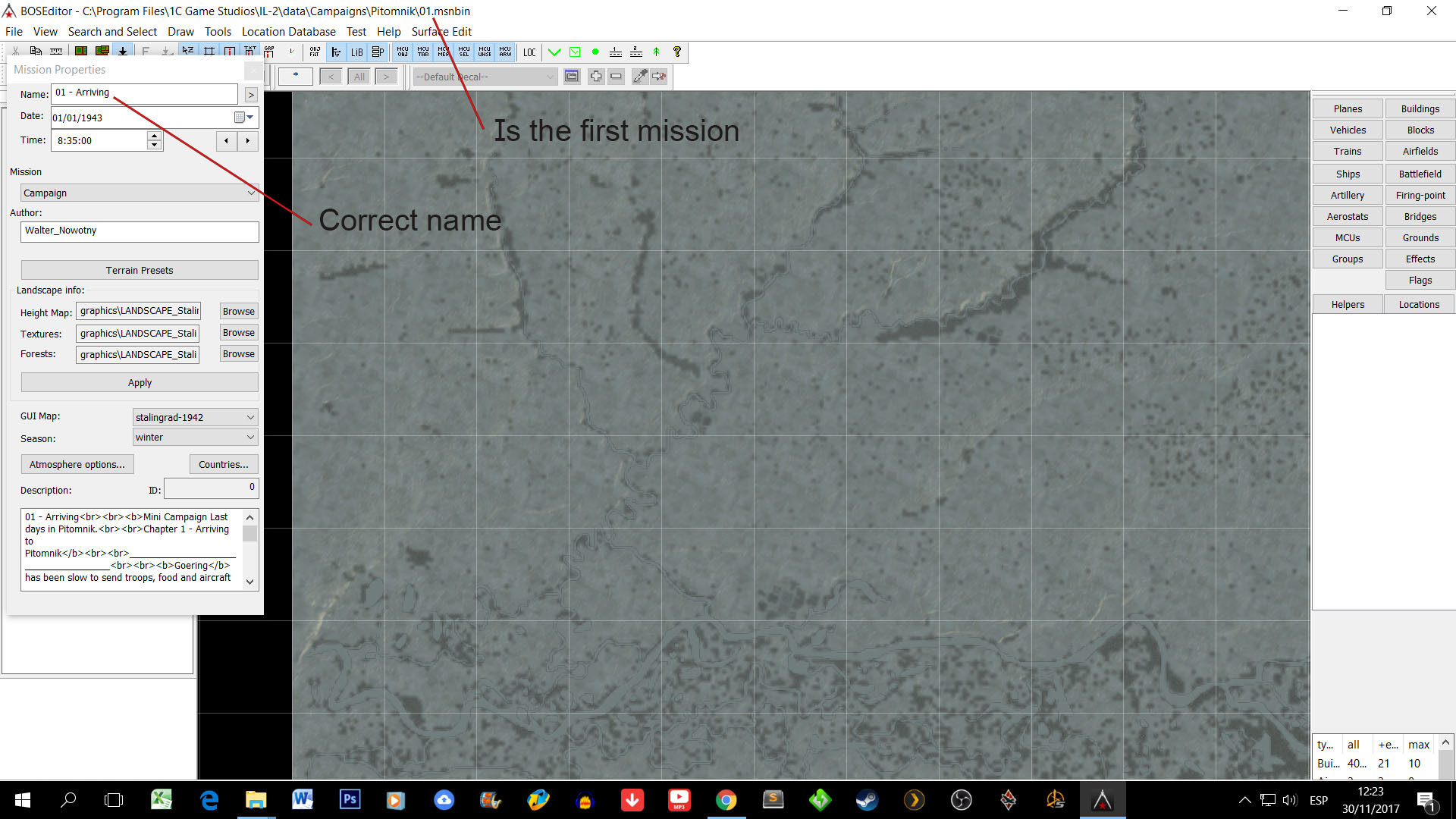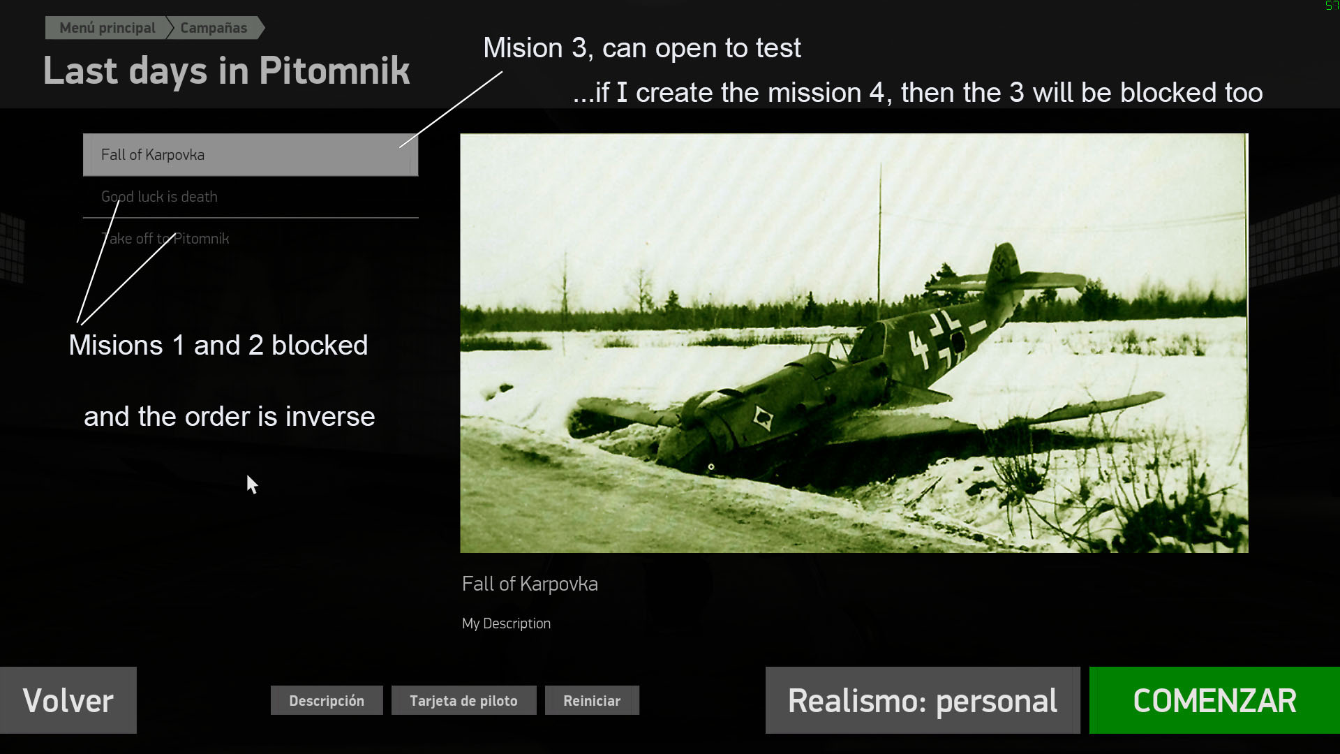 GOA_Walter_Nowotny Posted November 30, 2017 Author Posted November 30, 2017 Check out this link -> https://forum.il2sturmovik.com/topic/168-developer-diary/page-4?do=findComment&comment=424321 Thank you Sketch, The objective trigger is correctly placed. In fact it works on every mission that I finish as a test. The problem is that when creating a new one after the other, the other now is blocked (having completed the objective) they are blocked except the one I am creating. And the list is inverted, in the first place is mission 3, in second, mission 2 and in third place is mission 1. I have tried to change the title in ME like this: 1 - "mission name", 2 - " mission name ", but when entering the game these changes do not apply. Example: -The file 01.mission in the ME is called 1 - Arriving, but it is not changed in the game, it is still called "Take off to Pitomnik". -The file 02.mission in the ME is called 2 - Fall of Besargino, but when entering the game is still called Good luck is Death (that name was changed 4 days ago and continues to show in the game). I have reviewed other campaigns and all have names sorted by number (example 01, 02, 03 and so) Those are in order in the game. I have my missions in the same way (01, 02, 03 and so) but in the game they are shown in inverted order) As my English is not good, I do not know if I'm explaining myself well since I'm using Google translator) I wish my explanation was understood. Thank you