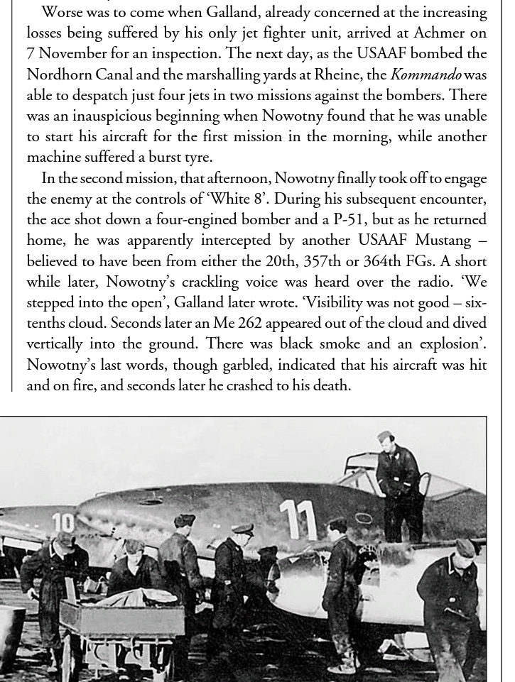 PatrickAWlson Posted December 19, 2017 Posted December 19, 2017 While it is not certain exactly how Nowontny's 262 caught fire, the information in Axel Urbanke's book on III./JG 54 (who covered the 262s of Kdo Nowotny) points to Nowotny's plane catching fire some time after engaging in combat with P-51s and heavy bombers and diving through the clouds before impacting the ground. Combat reports from American pilots who were chasing Nowotny's 262 state that, without warning, it suddenly rolled and dived in. Lieutenant Stevens, who claimed a 262 in that area, was likely the one who had previously scored hits on his plane, as he did claim a 262 shot down that day. There isn't anything there that suggests Nowotny was on landing approach. Galland (First and the Last) states that he heard Nowotny coming in. Nowotny's plane was then seen to plunge vertically out of the clouds and into the ground. The stories are not entirely inconsistent. Maybe Nowotny was already damaged an injured when he was trying to RTB - don't know. He did crash near his base.