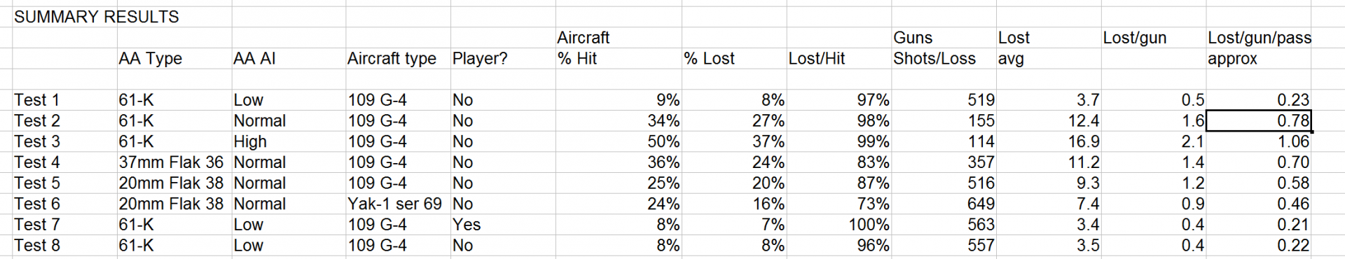 unreasonable Posted January 16, 2018 Posted January 16, 2018 (edited) I agree with the last point about being specific - this is why I have generally limited my comments in the current round of AA discussion to the low flying airfield attack case, for which we have data from no less than 16 airfields that came under attack, with OOBs and loss estimates for both sides. The data is as good as we are ever going to get for a wartime event 70 years ago, and is freely available in the book I mentioned previously. I would tabulate it all in summary form if I thought that might help, but if you genuinely prefer to base your thinking on your personal experience of never having shot down an aircraft with a Bofors I am not sure that it will. You never have actually shot down an aircraft, right? The test I set up - also posted so that other people can check it, along with the results of repeated test runs, in Custard's "Bravery of being out of range" thread, is based on a schematic version of JG3's attack plan, except using only two strafing runs per plane instead of at least three, to allow for the idea that the initial runs were unopposed. It uses 8 guns - obviously a K-61 is not a Bofors, but that is why I ran comparative tests. The best statistic to look at is actually something like losses/gun, or even better, losses/gun/pass. Roughly speaking the number of passes made (ie 2 in this test) times the number of guns = the number of good firing opportunities. Ammo expended per hit being more a matter of efficiency, and whether the crews expend huge amounts of ammo on low probability shots - as the AI does. As you can see in the High setting of the base 109 vs K-61 tests the guns actually score more than 1 losses per gun/pass - they can change targets so quickly and accurately that they will sometimes hit two aircraft from a formation in the same attack. The low setting is still a respectable score - the guns will get a hit almost one in four times. You are right that we do not know the exact number of guns that got into action or the exact number of passes made in the historic cases, but we have a pretty good idea. Excluding a "free" first attack, if the 60 aircraft of JG3 made on average one and a half more passes, and 30 of the 36 guns on establishment got into action, 5 confirmed kills is equal to 0.17 losses/gun, and 0.11 losses/gun/pass. Ie about half the test results on "Low". You would have to assume that less than half of the guns got into action to get similar results to the "Low" test. This is why I have said before that "Low" is order of magnitude OK as a historic setting for LAA, but probably about twice as good as it should be. It could perhaps represent excellent gunners in perfect conditions. Once you get to "High" you are an order of magnitude out. Edited January 16, 2018 by unreasonable 1