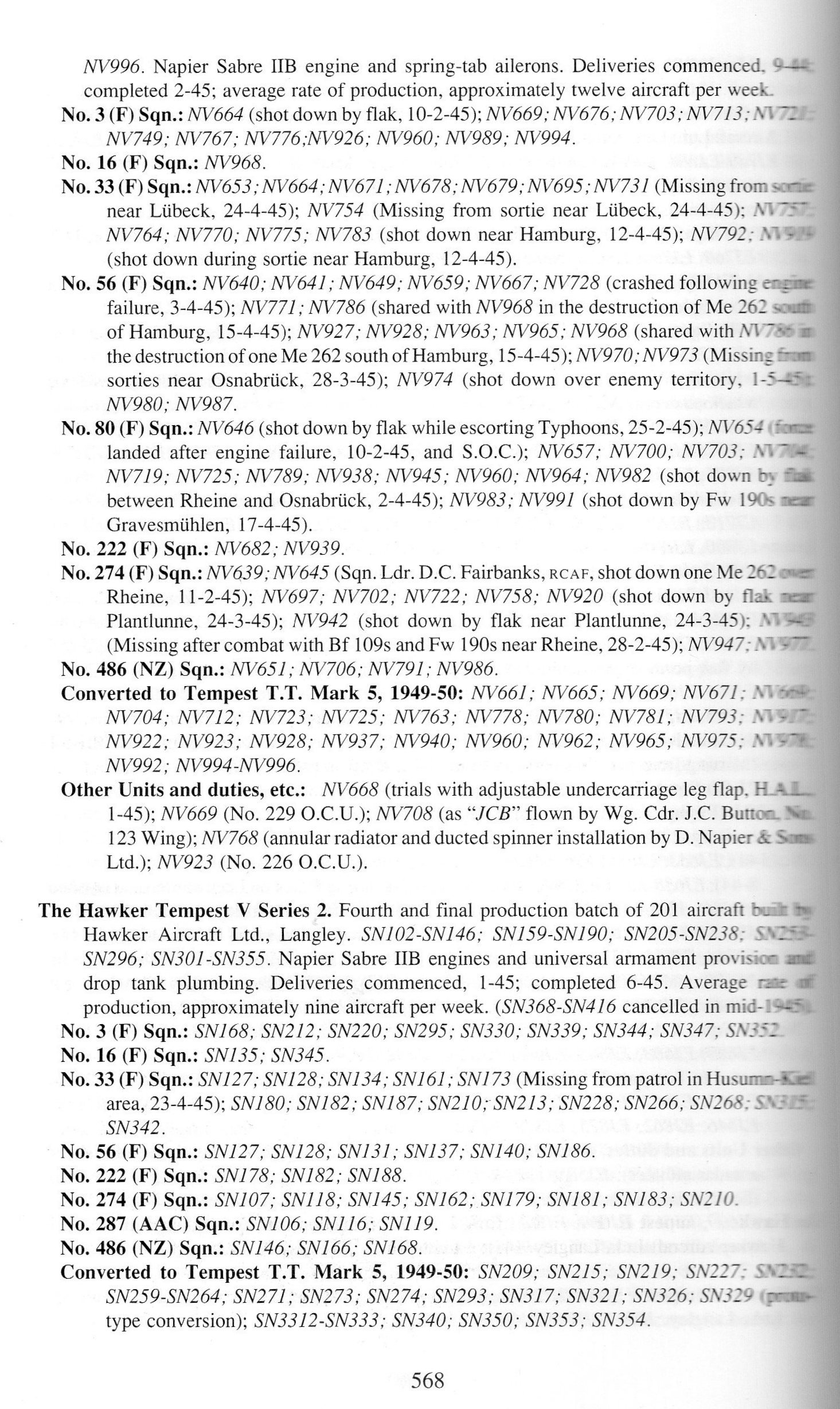 MiloMorai Posted August 25, 2018 Posted August 25, 2018 26 minutes ago, Talon_ said: I'll be honest from a purely gameplay perspective if we only get one Tempest it makes sense to go with an SN bird for the drop tanks. Alternatively some modified historicity would be okay with me in allowing drop tanks on whatever earlier model we get. SN series deliveries began deliveries 1.45 but didn't reach squadrons till 5.45. NV639 didn't arrive at #274 til 2.45. The Hawker Typhoon and Tempest / Mason