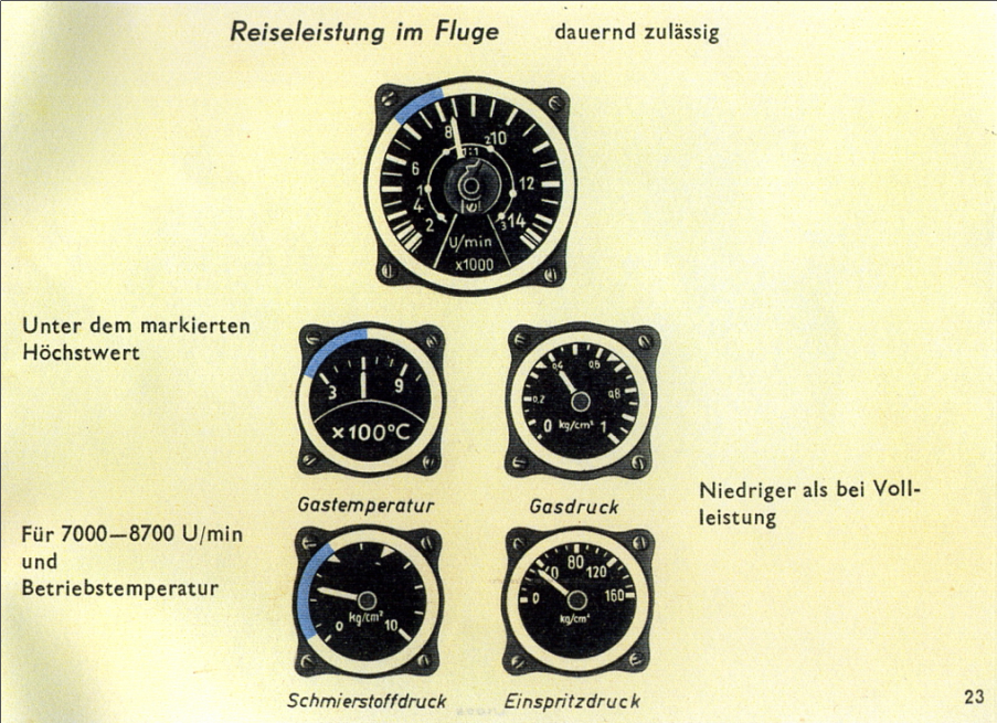 Psyrion Posted April 21, 2019 Posted April 21, 2019 (edited) The jumo 004 manual from september 1944 says to move the power slowly up to 6000rpm and quickly from there to full power. The (german) Test pilot notes on zenoswarbird quote Firtz Wendel: I guess that could come from different people understand "slowly" in different ways. The same Jumo004 manual also says that continous/crusing power is from 7000rpm upwards. Edited April 21, 2019 by Psyrion 1 1 2