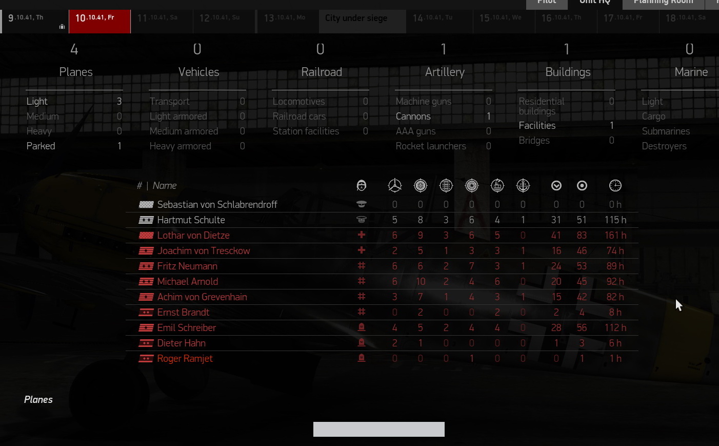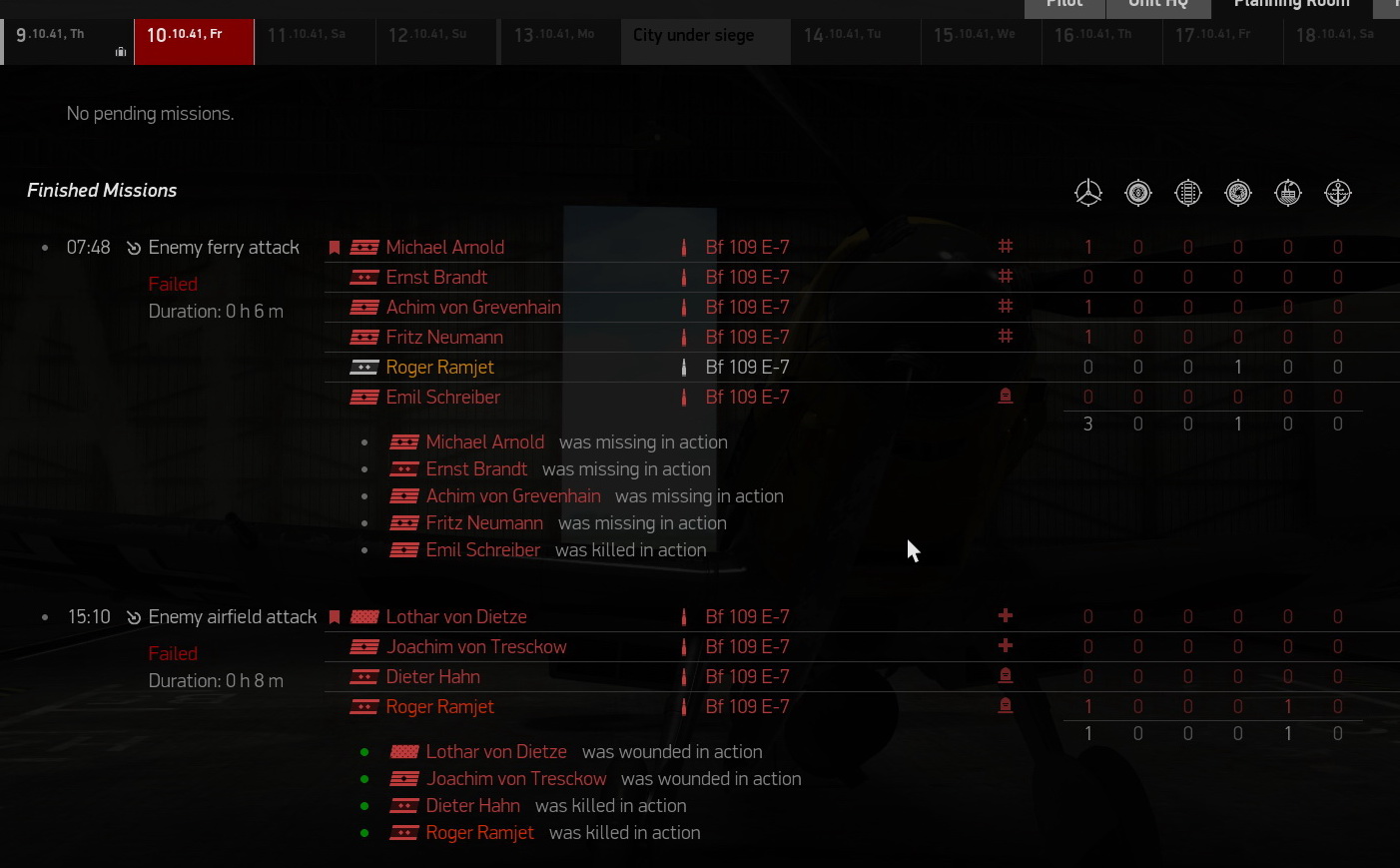 busdriver Posted March 23, 2018 Posted March 23, 2018 (edited) 3 hours ago, mort said: I've been too busy trying to keep myself alive and trying to ensure I don't drop my bomb on my own troops or airfield when I ditch it. I'll try to remember to check if my wingmen drop theirs next time. I've had mixed results with several attempts with E-7 careers. As an example, brand new Moderate & Dense career, my first day of Operation Typhoon. I was assigned both missions. First mission, I was #4 of a 6 plane formation, prior to crossing abeam our airfield headed north, we were attacked by some MiGs escorting a half dozen IL-2s. My 5 AI mates all jettisoned their bombs and fought in the horizontal, scoring 2 MiGs and 1 IL-2. Only Lead continued to our assigned target, I landed out of ammo. I was in gliding range of our field the whole time. Brutal. Second mission, I was #4 of 4. Same bad luck, MiGs escorting IL-2s attack our 4 E-7s. This time only Lead jettisoned immediately. #2 jettisoned only after MiGs made several passes (without firing). #3 never jettisoned, but generally flew trail formation off #2 until diving into the ground. No MiGs were shot down. Lead and #2 were downed by MiGs. I flew to the target alone because I had abandoned my flight. I died in a glorious fireball attempting a level delivery of my SC250 at nought height. #2 before he finally jettisoned and tried to fight back... #3 lawn dart...no battle damage First day mission results... Personnel status of II.(S)/LG2 at the close of business on the second official day of Operation Typhoon. Have started a new Moderate & Moderate career. First mission was to attack a convoy the east of our base. We were not attacked by soviet fighters. Anecdotally I'd say that Moderate & Dense in the Moscow campaign much more difficult for an E-7 pilot than a M&D Kuban P-39/Spitfire/Yak-1 career. Edited March 23, 2018 by busdriver