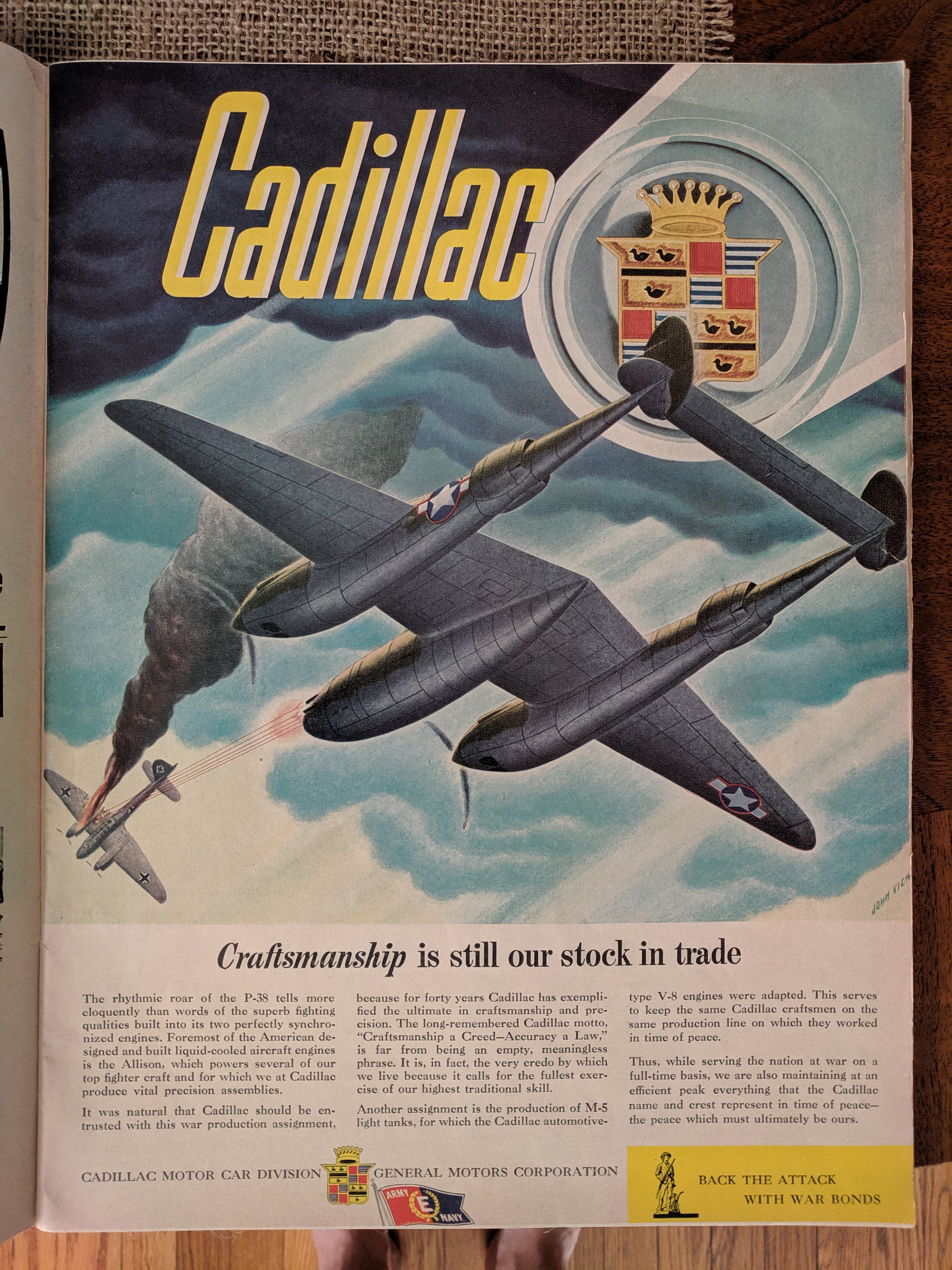 mazex Posted September 15, 2019 Posted September 15, 2019 (edited) 36 minutes ago, Feathered_IV said: Speaking of P-38 speculation, I wonder what happened next... Well, assuming that ended well we know that the P-38 had good negative pitch authority while inverted From that angle and pitch I would assume quite some negative G to get right. I did an outside loop once IRL (just to have done it). My eyes where red for two weeks. Not doing it again Another old P-38 artifact: I was on vacation with my family in Chicago this summer and stayed in a hipster appartment rented on Airbnb. It had a bunch of 1940:ies Life magazines casually spread on a sidetable that I spent some time with. Tons of interesting ads from companies producing military equipment during the war, like this one from november 1943. Interesting when debating what is actually the "Cadillac of the sky" (P-51 as everyone that have seen Empire of the sun knows ;)) But Cadillac obviously thought it was the P-38 And isn't the perspective skewed plane it is firing at an Me-410? An omen that it will be a premium? Edited September 15, 2019 by mazex 1