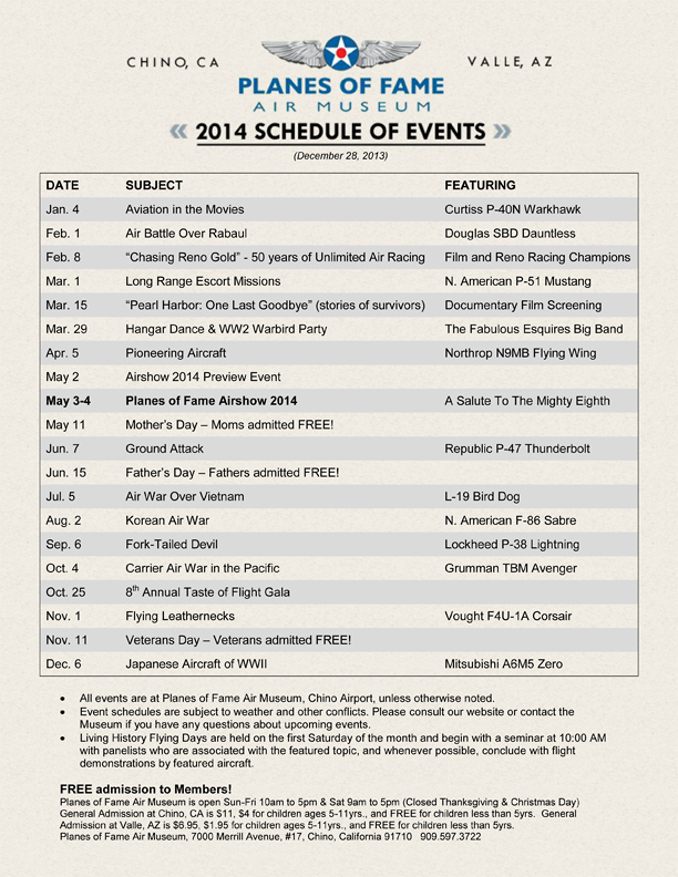 352nd_Wheels Posted May 2, 2014 Author Posted May 2, 2014 Bump for May It is airshow weekend!!!Planes of Fame Events Calendar: http://www.planesoffame.org/index.php?page=events-calendar2014 Schedule of Events: http://www.planesoffame.org/index.php?page=2014_calendarMay 02, 2014 - Air Show 2014 Preview Event On Friday, May 2nd, Planes of Fame Air Museum will have a special ‘Airshow 2014 Preview’ event. The only way to be a part of this ‘2014 Airshow Preview’ event is to visit Planes of Fame Air Museum. Visitors & Planes of Fame Air Museum members can come to the museum during normal museum hours on Friday May 2nd and, after entering the museum, take a tram to the ramp to view arriving aircraft and practice sessions. The first practice session will be from 1:00-2:30PM and the second practice session from 3:00-4:00PM. Museum Members are admitted without charge as usual and visitors pay regular museum entrance fees. Planes of Fame Air Museum Members can then come to Airshow on either Saturday or Sunday without charge to enjoy the entire performance.2014 Planes of Fame Air Show Preview Day Schedule of Events:10:00: Planes of Fame Air Museum Opens10:00 – 1:00: Viewing of Static Displays and Arriving Aircraft1:00 – 1:20: Sean D. Tucker - Team Oracle Aerobatics (Rehearsal)1:20 – 1:45: Bremont Horsemen Aerobatic Team: Featuring three F-86 Sabre Jets (Rehearsal)1:45 – 2:00: Rob Harrison “The Tumbling Bear” Zlin 142c Aerobatics (Rehearsal)2:00 – 2:15: Clay Lacy Learjet Aerobatic Demonstration (Rehearsal)2:15 – 2:30: MiG 15 (Practice)2:30 – 3:00: BREAK3:00 – 3:20: Bremont Horsemen Aerobatic Team: Featuring three P-51 Mustangs (Rehearsal)3:20 – 3:50: Sean D. Tucker - Team Oracle Aerobatics (Rehearsal)3:50 – 4:10: USAF F-22 Raptor Heritage Demonstration Flight (Rehearsal)4:10 – 4:30: USAF Heritage Flight Demonstration: F-22 Raptor, P-38, P-47, P-51, B-25 (Rehearsal)4:30: End of Planes of Fame Air Show Preview Event DaySee you at the Preview and the Air Show!----------------------------------------------------------------Planes of Fame Air Show 2014 - General InformationSaturday May 03 and Sunday May 04, 2014Experience the Excitement!Mooney International Corporation is proud to present Planes of Fame Air Show 2014, May 3 & 4: "A Salute to the Mighty Eighth". This year’s airshow will feature over 40 historic aircraft, performing for your enjoyment as well as a salute to the 8th Air Force in WWII. We invite you to Airshow 2014 to celebrate the history and contributions of the men, women, and aircraft of the 8th Air Force. Performers include U.S.A.F. F-22 Raptor Demo Team and Heritage Flight, Sean D. Tucker-Team Oracle Aerobatics, The Bremont Horsemen, Sea Fury Aerobatics by Sanders Aeronautics, Clay Lacy's Learjet Demonstration, Rob Harrison and the Tumbling Bear, John Collver's AT-6 Aerobatics, and over 40 WWII aircraft including B-17, P-47s, and P-51s. In addition to many other fantastic airplanes performing, there will be a panel discussion with our honored veterans of the 8th Air Force, which include Clarence "Bud" Anderson, Jack Croul, Jim White, Wilbur Richardson, and George Thomas.Also, be sure to catch the Airshow Preview Event on May 2! Check out the on YouTube.A terrific selection of merchandise will be on sale in the Vendor Marketplace as well as delicious food and beverages. Reserved bleacher seating will be available; look for information under Ticket Information on the FAQ page when available.2014 Planes of Fame Air Show Schedule of Events:8:00 >> Gates Open >> Static Displays & tours of warbirds9:30-10:30: >> Veterans Panel >> Held at Announcer Stand11:00-11:20: >> Opening Ceremony >> National Anthem, Multiple Aircraft Fly-Over11:20-11:30: >> N9MB Flying Wing >> Flight Demonstration by Ron Hackworth11:30-11:40: >> Rob Harrison Aerobatics >> Aerobatic Performance by the Rob Harrison, “Tumbling Bear” in his Zlin 142c11:40-12:00: >> Pacific Theater Demonstration >> Two F4Us, F4F, F6F, two B-25s, F8F, P-51, SBD, two TBMs, Val, Zero, FM-2 Wildcat, P-4012:00-12:15: >> Bremont Horsemen >> Three P-51 Formation Aerobatics12:15-12:35: >> Lucas Oil Jet Car >> Lucas Oil demonstrates their jet car12:35-12:50: >> Intermission 12:50-1:20: >> Korean Air Battle Demonstration >> F-86, MIG-15, T-33, P-51, F4U, AD-5, F7F, T-61:20-1:40: >> Sean D. Tucker >> Performs Aerobatics in his Team Oracle Challenger II Biplane1:40-2:00: >> F-22 Raptor >> USAF F-22 Raptor Demonstration Team2:00-2:15: >> USAF Heritage Flight >> F-22, P-38, P-47 & P-51 Formation Fly-bys2:15-2:25: >> P-47 Flight >> Six P-47s in formational fly-bys2:25-2:45: >> European Theater Demonstration >> B-17s, P-38, P-51s, P-40s, Spitfires, P-632:45-3:00: >> John Collver >> T-6 "War Dog" Aerobatics3:00-3:15: >> Clay Lacy >> Learjet Aerobatic Demonstration3:15-3:30: >> Bremont Horsemen >> Three F-86 Aerobatic Team4:00: >> End of Air Show >> Thank you for coming!4:35: >> Chino Airport >> Resumes Normal OperationsWHERE: Planes of Fame Air Museum7000 Merrill Avenue #17Chino, CA 91710WHY: It is the Mission of Planes of Fame Air Museum to preserve aviation history, inspire interest in aviation, educate the public, and honor aviation pioneers and veterans. The Museum sponsors regular events in the form of inspirational experiences, educational presentations, flight demonstrations, and airshows in fulfillment of this mission.Planes of Fame Air Museum, ‘Where Warbirds Fly and Aviation History Lives’----------------------------------------------------------------Hope to see you there this weekend. Wheels