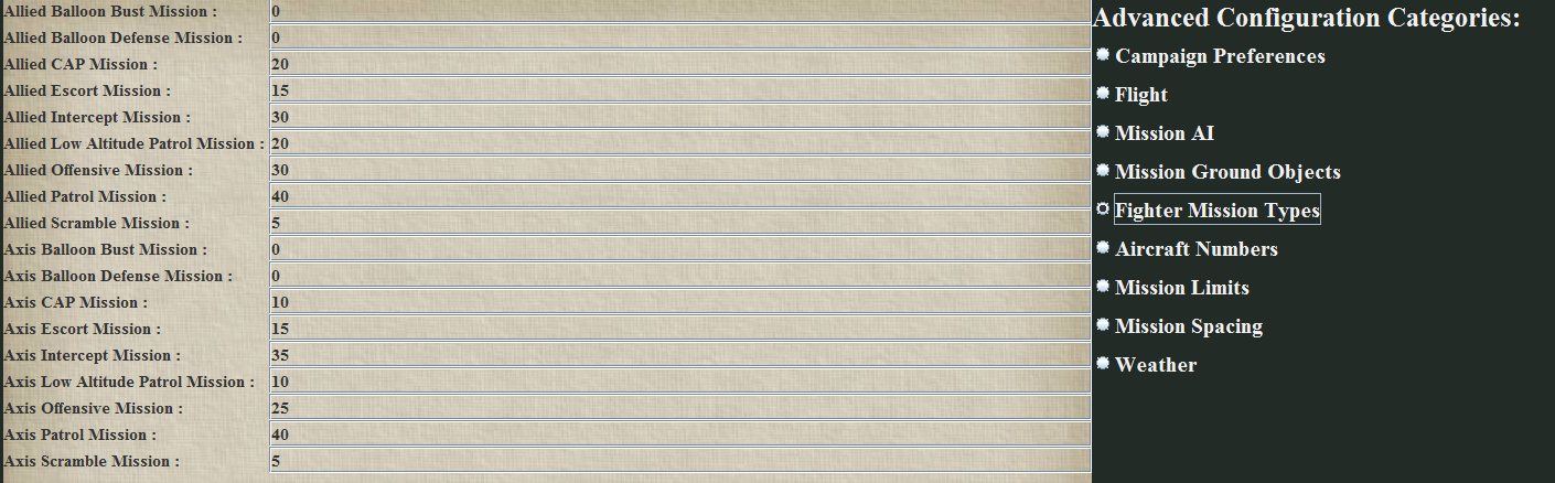 SwallowFire Posted May 6, 2018 Posted May 6, 2018 On 3/29/2018 at 2:55 PM, Feathered_IV said: It looks like there are quite a few yet to be added, however I found what appears to be the full list in one of the packed files as I was working on a mod. MissionTypes { 101 = "Intercept bombers"; 102 = "Intercept ground attack aircraft"; 103 = "Intercept cargo aircraft"; 151 = "Escort bombers"; 152 = "Escort ground attack aircraft"; 153 = "Escort cargo aircraft"; 201 = "Enemy column attack"; 202 = "Enemy artillery position attack"; 203 = "Enemy train attack"; 204 = "Enemy airfield attack"; 301 = "Ground troops support"; 331 = "Cargo delivery"; 332 = "Cargo supply drop"; 351 = "Special mission squad paradrop"; 401 = "Enemy artillery positions bombing strike"; 402 = "Enemy railway station bombing strike"; 403 = "Enemy airfield bombing strike"; 404 = "Enemy supply dump bombing strike"; 405 = "Enemy bridge bombing strike"; 701 = "Skirmish"; 702 = "Duel"; 703 = "Free flight"; 1101 = "Intercept bombers"; 1102 = "Intercept ground attack aircraft"; 1103 = "Intercept reconnaissance aircraft"; 1104 = "Intercept transport aircraft"; 1121 = "Area patrol"; 1122 = "Ground troops cover"; 1123 = "Free hunt"; 1124 = "Ships cover"; 1125 = "Ferry cover"; 1151 = "Escort bombers"; 1152 = "Escort ground attack aircraft"; 1153 = "Escort transport aircraft"; 1154 = "Escort reconnaissance aircraft"; 1155 = "Escort artillery spotter"; 1201 = "Enemy transport column attack"; 1202 = "Enemy armor column attack"; 1203 = "Enemy artillery position attack"; 1204 = "Enemy frontline attack"; 1205 = "Enemy railway junction attack"; 1206 = "Enemy airfield attack"; 1207 = "Search and destroy"; 1208 = "Attack enemy ferry crossing"; 1209 = "Enemy troops concentration area attack"; 1301 = "Advancing troops support"; 1302 = "Defense lines support"; 1401 = "Battlefield reconnaissance"; 1402 = "Communication lines reconnaissance"; 1403 = "Photo reconnaissance"; 1501 = "Enemy artillery positions bombing strike"; 1502 = "Enemy frontline strong point bombing strike"; 1503 = "Enemy troops concentration bombing strike"; 1504 = "Enemy airfield bombing strike"; 1505 = "Enemy ferry bombing strike"; 1506 = "Enemy railway junction bombing strike"; 1507 = "Enemy supply dump bombing strike"; 1508 = "Enemy bridge bombing strike"; 1601 = "Cargo delivery"; 1602 = "Cargo paradrop"; 1603 = "Special mission squad paradrop"; 1901 = "Relocate"; 1902 = "Moving out"; } I found a list of mission types in the career. I would categorize them into intercept, area patrol, cover, escort, ground attack, ground support and bombing. In comparison cover, ground support is probably missing in pwcg for fighters. But in career mode there's no scramble mission.